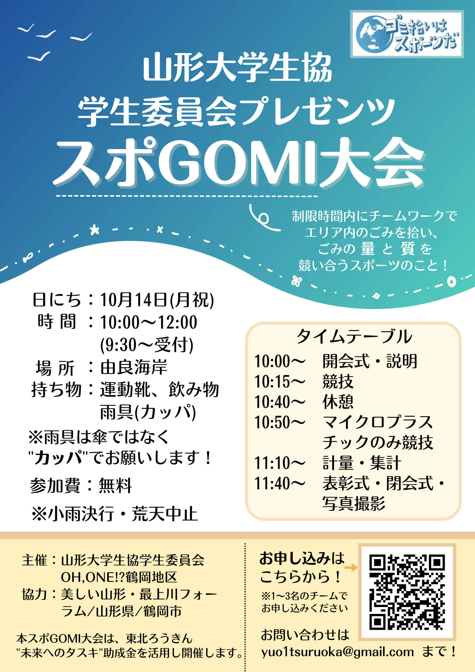 « すべてのイベント このイベントは終了しました。 山形大学生協学生委員会プレゼンツ スポGOMI大会 2024年10月14日10:00 - 12:00 無料 « 由良海岸 de スポーツ! 銅版画講座~ソフトグランドで版画作品づくり~ » このチラシはこちらからダウンロードください。(J-peg画像) + Google カレンダー+ iCal エクスポート 詳細 日付: 2024年10月14日 時間: 10:00 - 12:00 参加費: 無料 イベントカテゴリー: 団体主催 主催者 山形大学生協学生委員会 会場 由良海岸 山形県由良海岸 999-7464 + Google マップ