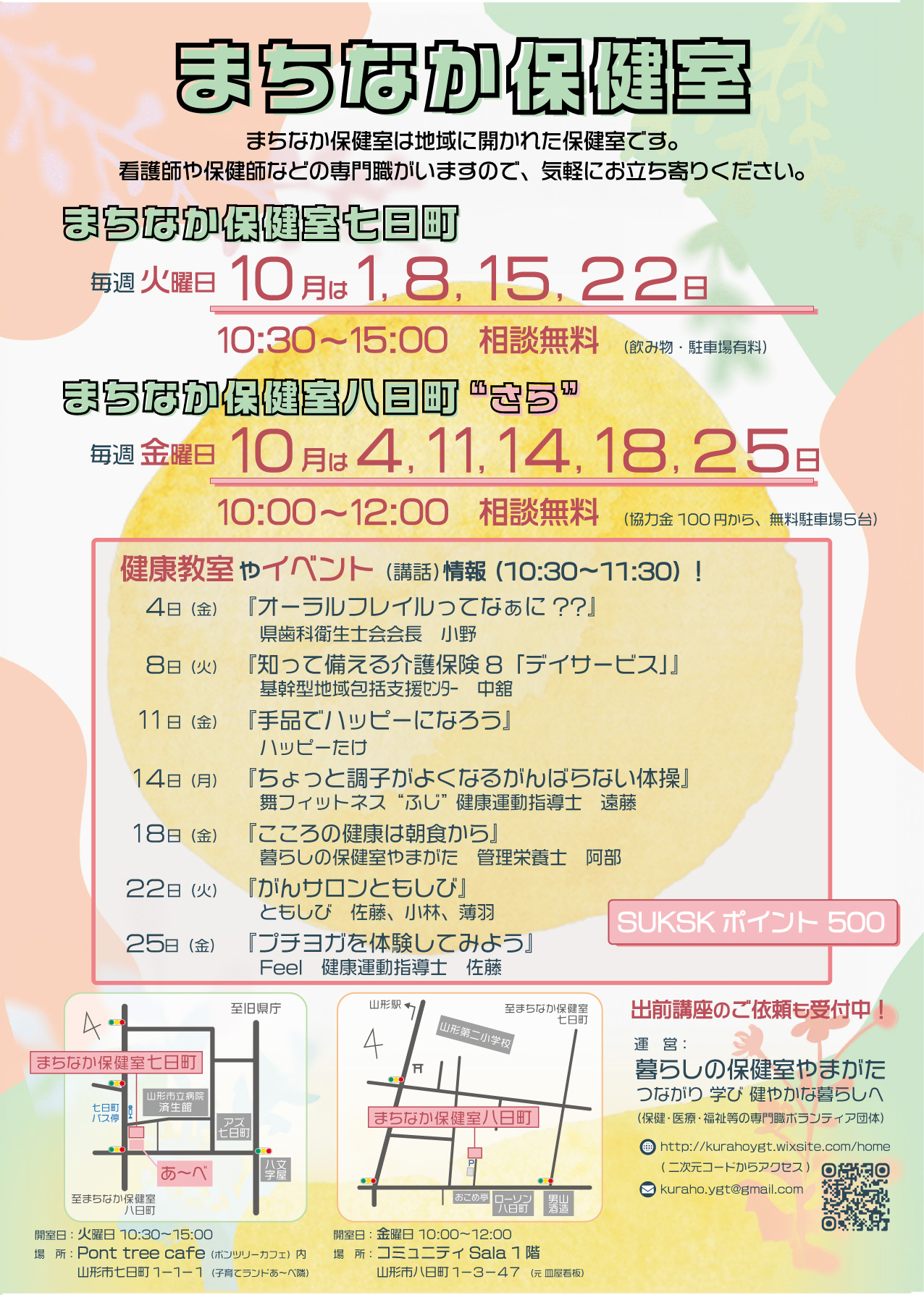 « すべてのイベント このイベントは終了しました。 まちなか保健室七日町 2024年10月15日10:30 - 15:00 « 銅版画講座~ソフトグランドで版画作品づくり~ あなたも「とぴボラ」してみませんか? » まちなか保健室七日町 毎週火曜日 15:30~15:30 チラシはこちらからダウンロードできます(PDF形式) + Google カレンダー+ iCal エクスポート 詳細 日付: 2024年10月15日 時間: 10:30 - 15:00 イベントカテゴリー: 団体主催 主催者 暮らしの保健室やまがた メール: kuraho.ygt @gmail.com Web サイト: https://kurahoygt.wixsite.com/ 会場 Pont tree cafe(ポンツリーカフェ) 山形市七日町1-1-1 + Google マップ