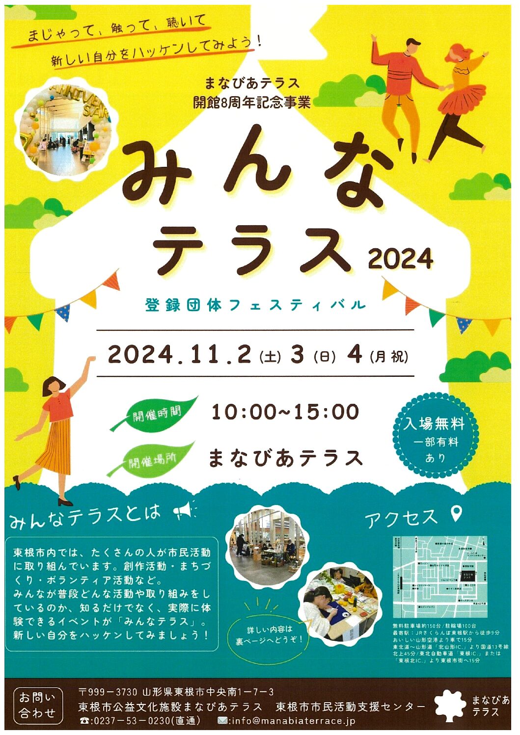 « すべてのイベント このイベントは終了しました。 まなびあテラス開館8周年記念事業 登録団体フェスティバル「みんなテラス2024」 2024年11月2日10:00 - 15:00 « あいらぶ♡末広楽市楽茶 一箱古本市@ひがしね » チラシはこちらからダウンロードできます(PDF形式) + Google カレンダー+ iCal エクスポート 詳細 日付: 2024年11月2日 時間: 10:00 - 15:00 イベントカテゴリー: 団体主催 主催者 東根市公益文化施設まなびあテラス 市民活動支援センター 電話番号: 0237-53-0230 会場 東根市公益文化施設まなびあテラス 市民活動支援センター 中央南1-7-3 東根市, 山形県 9993730 日本 + Google マップ 電話番号: 0237-53-0230 Web サイト: https://www.manabiaterrace.jp/
