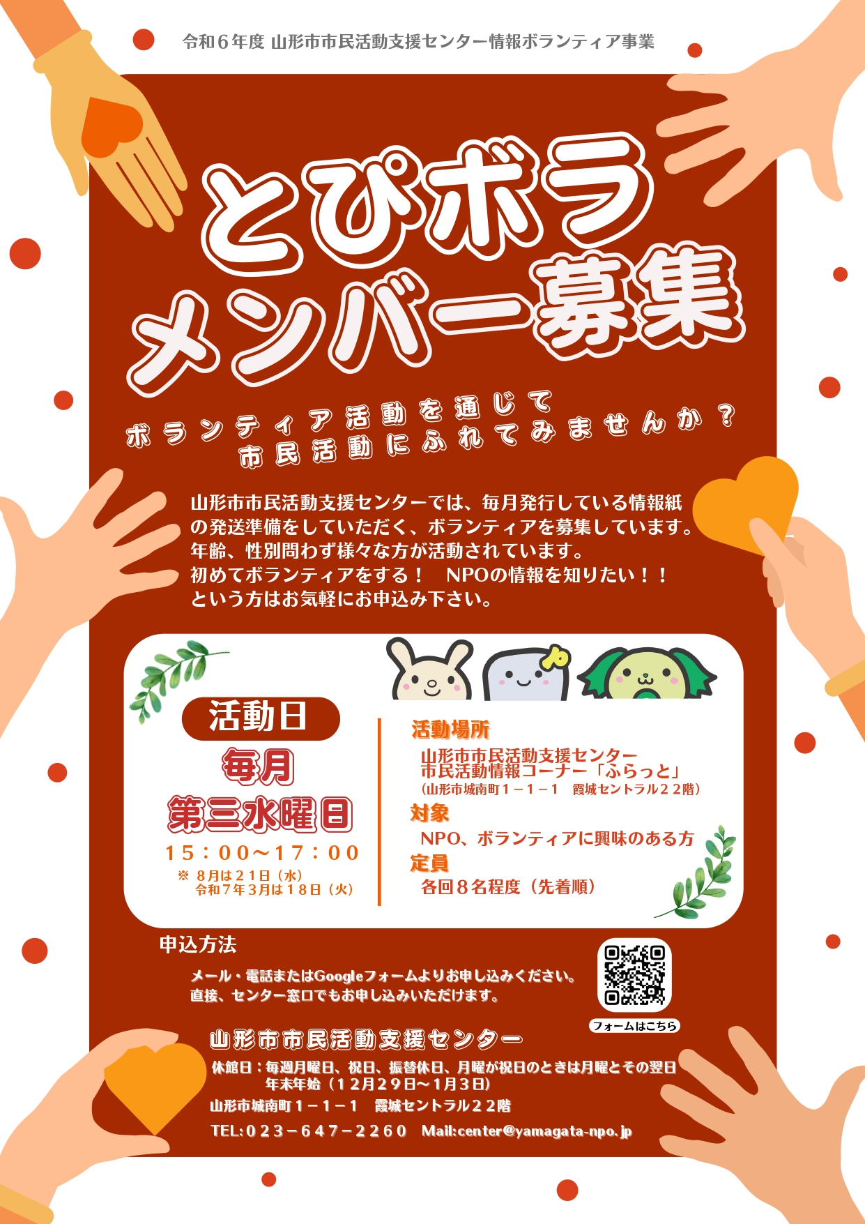 « すべてのイベント このイベントは終了しました。 あなたも「とぴボラ」してみませんか? 2024年10月16日15:00 - 17:00 « まちなか保健室七日町 まちなか保健室八日町”さら” こころの健康は朝食から » チラシはこちらからダウンロードできます(PDF) ※毎月第三水曜日に開催予定です。 ※休館日や講座によって開催日が変更となる場合がございます。 + Google カレンダー+ iCal エクスポート 詳細 日付: 2024年10月16日 時間: 15:00 - 17:00 イベントカテゴリー: センター主催 イベント タグ: とぴボラ 主催者 山形市市民活動支援センター 電話番号: 023-647-2260 Web サイト: https://www.yamagata-npo.jp/ 会場 山形市市民活動支援センター ふらっと+B会議室 山形市城南町1-1-1 山形市, 山形県 990-8580 日本 + Google マップ