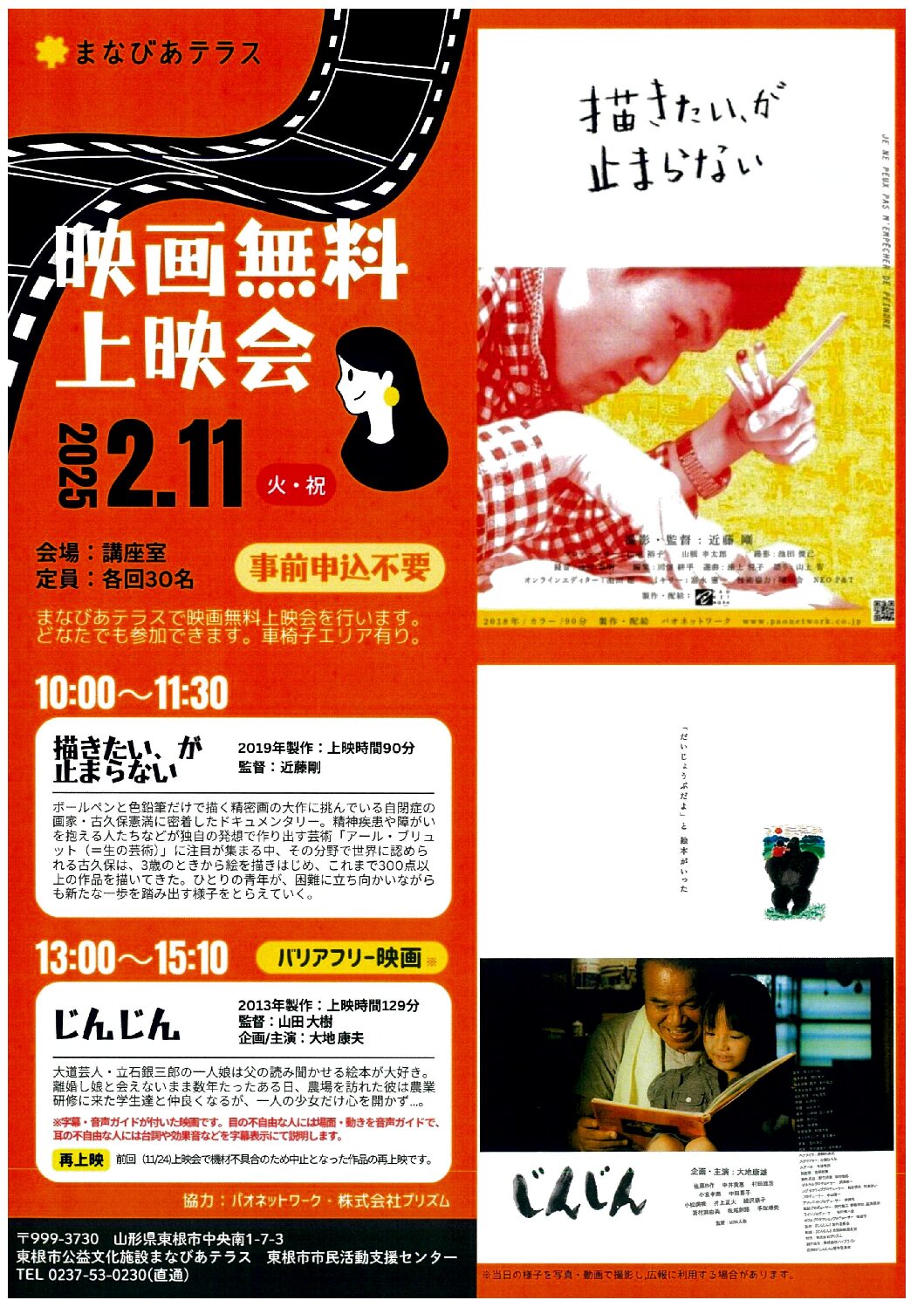« すべてのイベント このイベントは終了しました。 まなびあテラス~映画無料上映会~ 2025年2月11日10:00 - 15:30 無料 « ギャンブル依存症セミナー&家族相談会 山形 第41回 哲学カフェ 「品格」の問題 » チラシはこちらからダウンロードできます(PDF形式) + Google カレンダー+ iCal エクスポート 詳細 日付: 2025年2月11日 時間: 10:00 - 15:30 参加費: 無料 イベントカテゴリー: 団体主催 Web サイト: https://www.manabiaterrace.jp/event/support-center/ 主催者 東根市公益文科施設まなびあテラス 会場 東根市公益文化施設まなびあテラス 市民活動支援センター 中央南1-7-3 東根市, 山形県 9993730 日本 + Google マップ 電話番号: 0237-53-0230 Web サイト: https://www.manabiaterrace.jp/