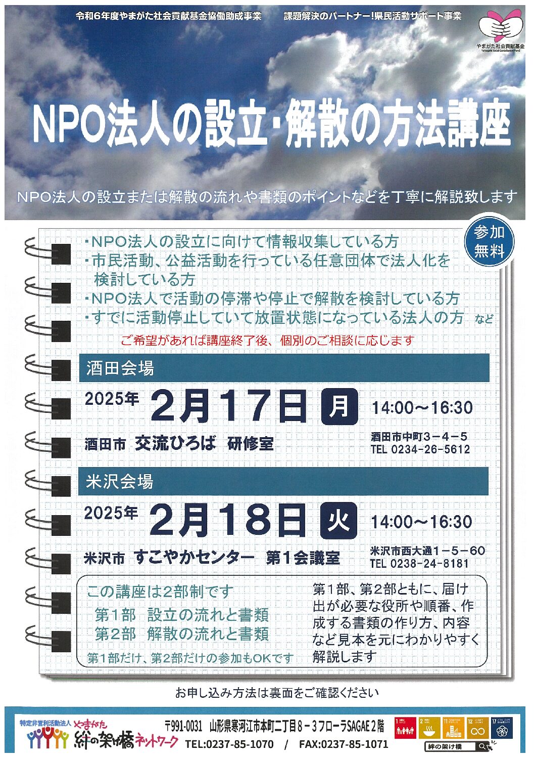 « すべてのイベント このイベントは終了しました。 ~NPO法人の設立・解散の方法講座~ 2025年2月17日14:00 - 16:30 « <中高生のためのボランティア入門講座> まちなか保健室七日町 » ここからチラシをダウンロードできます。 + Google カレンダー+ iCal エクスポート 詳細 日付: 2025年2月17日 時間: 14:00 - 16:30 イベントカテゴリー: 団体主催 Web サイト: https://kakehasi.jpn.org/ 主催者 特定非営利活動法人 やまがた絆の架け橋ネットワーク 電話番号: 0237-85-1070 Web サイト: http://kakehasi.jpn.org/ 会場 酒田市交流ひろば 2F 交流室(酒田市中町3丁目4-5) 酒田市中町3-4-5 酒田市, 山形県 998-0044 日本 + Google マップ 電話番号: 0234-26-5612 Web サイト: https://www.city.sakata.lg.jp/shisei/shisetsu/kanrenshisetsu/kouryuuhiroba.html
