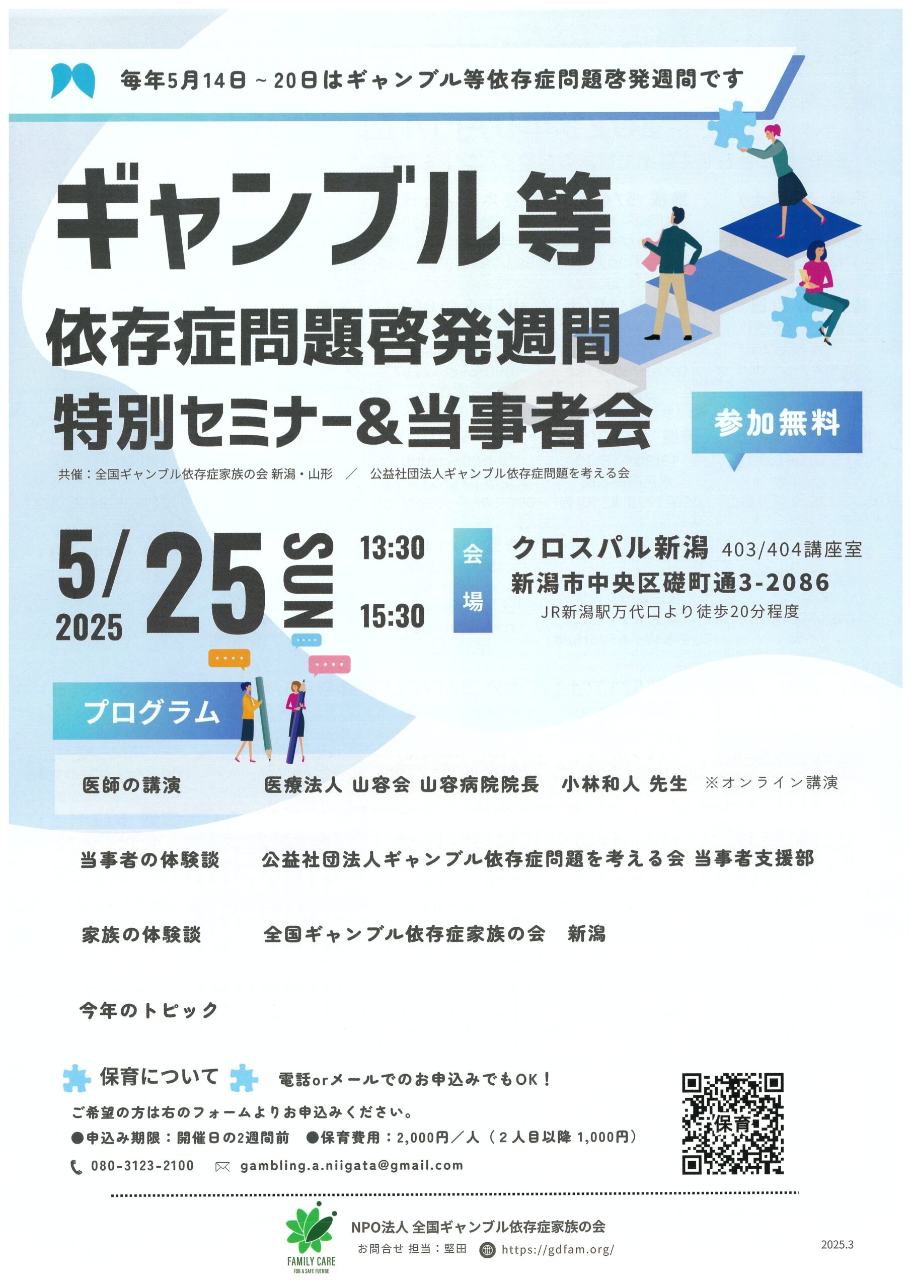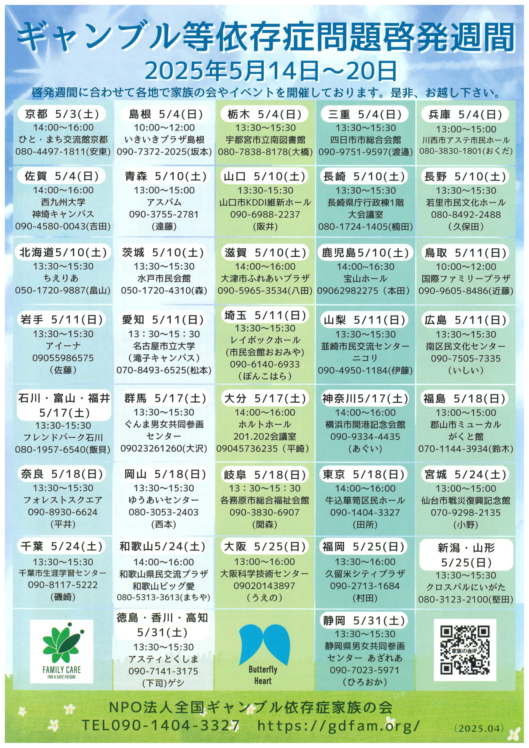 « すべてのイベント このイベントは終了しました。 ギャンブル等依存症問題啓発週間 特別セミナー&当事者会 2025年5月25日13:30 - 15:30 無料 « 無料カウンセリングのご案内 ~(一社)日本産業カウンセラー協会東北支部・山形こころ塾~ 第27回 山形センター合唱団演奏会 » チラシはこちらから(PDF) + Google カレンダー+ iCal エクスポート 詳細 日付: 2025年5月25日 時間: 13:30 - 15:30 参加費: 無料 イベントカテゴリー: その他主催, 団体主催 主催者 NPO法人全国ギャンブル依存症家族の会 電話番号: 050-1725-8337 Web サイト: https://gdfam.org/ 会場 クロスパル新潟 403/404講座室 中央区磯町通3-2086 新潟市, 新潟県 日本 + Google マップ