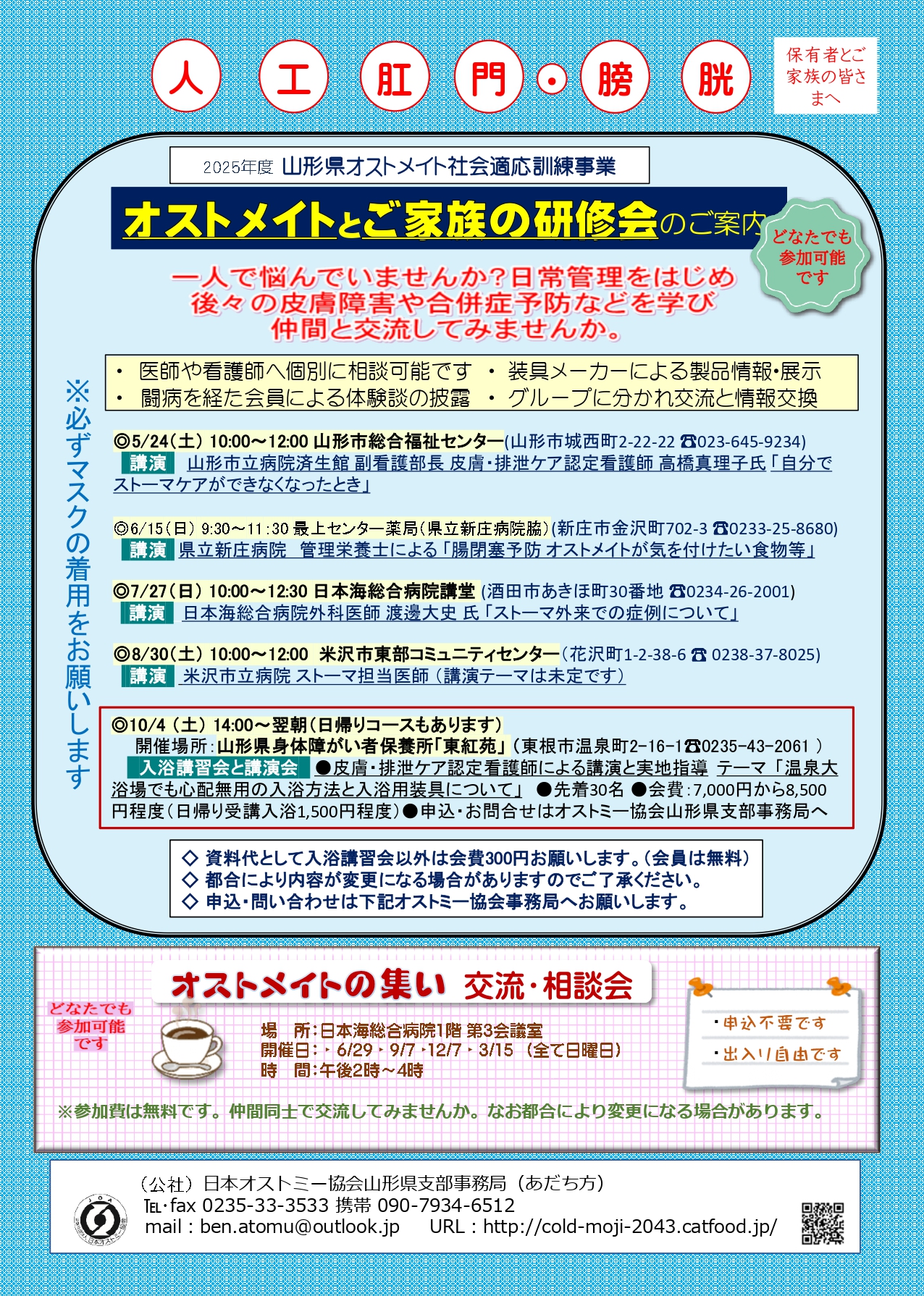 « すべてのイベント このイベントは終了しました。 オストメイトとご家族の研修会 2025年8月30日10:00 - 12:00 300 « 山の基本を学び登山しようぜ!葉っぱ塾・安全登山入門編 2025 ~大切な命を守るため~いざという時に役立つ防災と応急手当 » 資料はこちらから(PDF) + Google カレンダー+ iCal エクスポート 詳細 日付: 2025年8月30日 時間: 10:00 - 12:00 参加費: 300 イベントカテゴリー: 団体主催 主催者 (公社)日本オストミー協会山形県支部 Web サイト: https://cold-moji-2043.catfood.jp/ 会場 米沢市東部コミュニティセンター 花沢町1-2-38-6 米沢市, 山形県 9920022 日本 + Google マップ 電話番号: 0238-37-8025