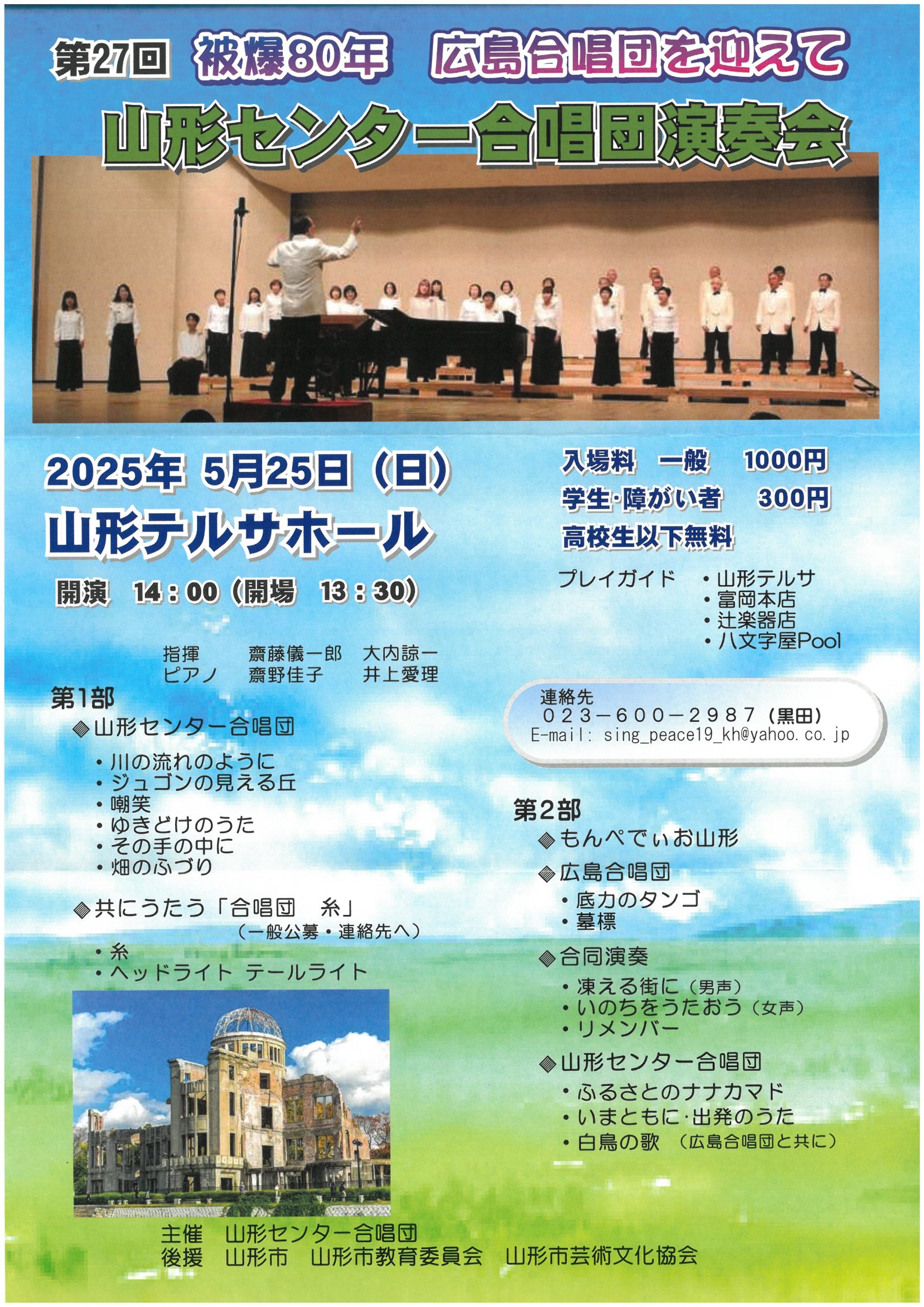 « すべてのイベント このイベントは終了しました。 第27回 山形センター合唱団演奏会 2025年5月25日14:00 1000円 « ギャンブル等依存症問題啓発週間 特別セミナー&当事者会 地域食堂「楽(らく)」 » チラシはこちらから(PDF) + Google カレンダー+ iCal エクスポート 詳細 日付: 2025年5月25日 時間: 14:00 参加費: 1000円 イベントカテゴリー: 団体主催 主催者 山形センター合唱団 電話番号: 023-600-2987(黒田) メール: sing_peace19_kh@yahoo.co.jp 会場 山形テルサホール 双葉町1丁目2−3 山形市, 山形県 日本 + Google マップ