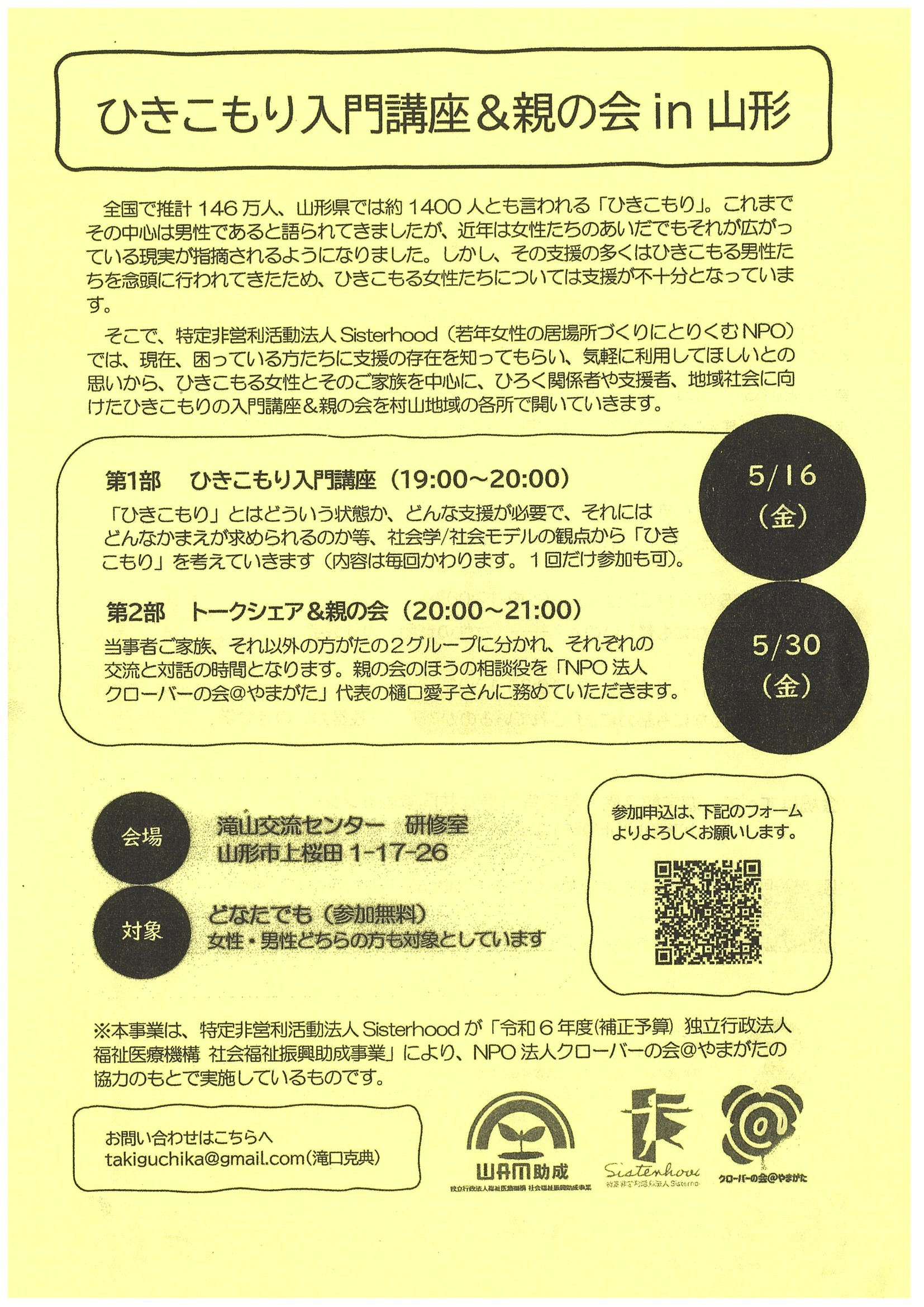 « すべてのイベント このイベントは終了しました。 ひきこもり入門講座&親の会 in 山形 2025年5月16日19:00 - 20:00 « まちなか保健室八日町”さら” 〈独身者対象〉通院が必要な方&理解してくれる方の交流会 » チラシは下記からダウンロードできます。 ひきこもり入門講座&親の会 チラシ(PDF形式) + Google カレンダー+ iCal エクスポート 詳細 日付: 2025年5月16日 時間: 19:00 - 20:00 イベントカテゴリー: 団体主催 主催者 NPO法人Sisterhood Web サイト: https://sisterhood-yamagata.com/ 会場 滝山コミュニティセンター 上桜田1-17-26 山形市, 山形県 Japan + Google マップ