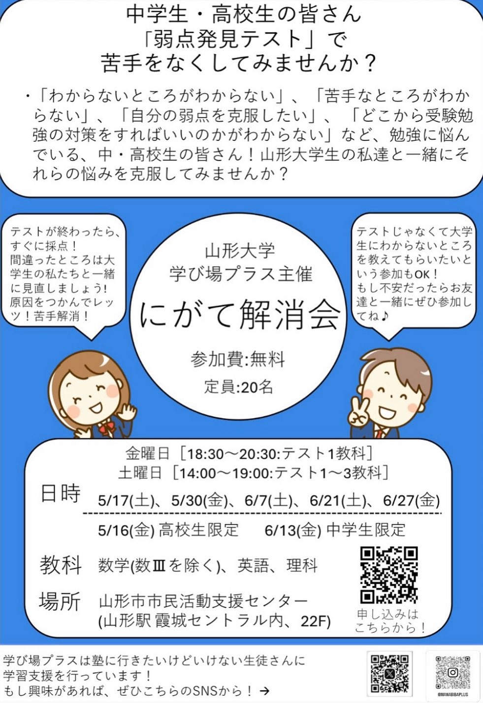 « すべてのイベント このイベントは終了しました。 山形大学 学び場プラス主催「にがて解消会」 2025年5月17日14:00 - 19:00 無料 « 〈独身者対象〉通院が必要な方&理解してくれる方の交流会 野良猫の相談会 » + Google カレンダー+ iCal エクスポート 詳細 日付: 2025年5月17日 時間: 14:00 - 19:00 参加費: 無料 イベントカテゴリー: 団体主催 会場 山形市市民活動支援センター 山形市城南町1-1-1 霞城セントラル22階 主催者 学び場プラス