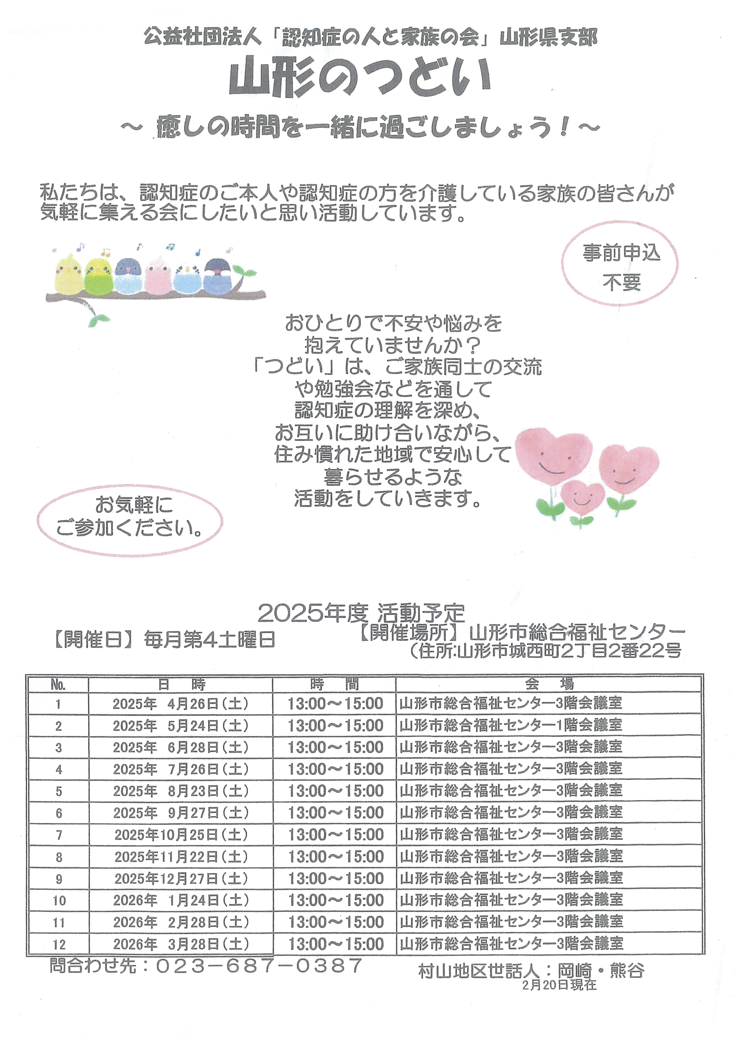 « すべてのイベント このイベントは終了しました。 公益社団法人「認知症の人と家族の会」山形県支部 山形のつどい 2月 28日13:00 - 15:00 無料 « おしゃべりアート鑑賞ワークショップ アートツリーやまがたVol.14 » チラシはこちらから(PDF) + Google カレンダー+ iCal エクスポート 詳細 日付: 2月 28日 時間: 13:00 - 15:00 参加費: 無料 イベントカテゴリー: 団体主催 主催者 公益社団法人 認知症の人と家族の会山形県支部 電話番号: 023-687-0387 メール: kazokuokai@camel.plala.or.jp 会場 山形市総合福祉センター 3階 山形市城西町2-2-22 + Google マップ