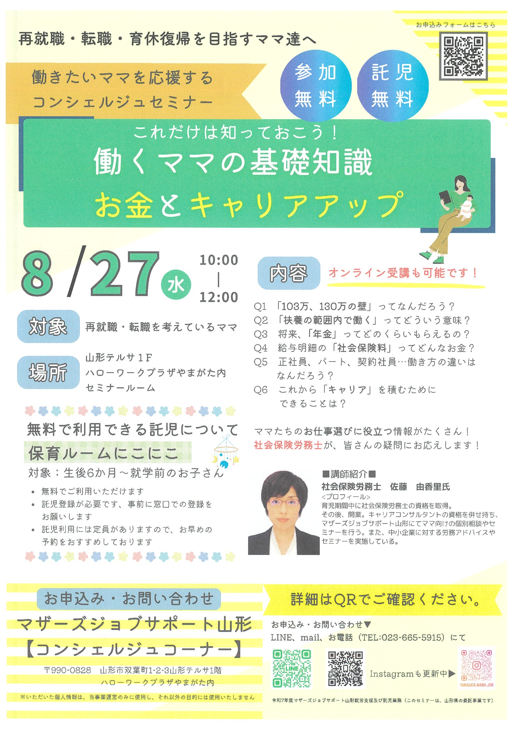« すべてのイベント このイベントは終了しました。 これだけは知っておこう!働くママの基礎知識 お金とキャリアアップ 2025年8月27日10:00 - 12:00 無料 « 業務改善DX講座 オープンソース ノーコード・ローコードツール「プリザンター®」セミナー 令和7年度 次世代人材育成事業 ユースリーダー養成講座 第3回 » ・働くママの基礎知識チラシ(PDF形式) + Google カレンダー+ iCal エクスポート 詳細 日付: 2025年8月27日 時間: 10:00 - 12:00 参加費: 無料 イベントカテゴリー: 団体主催 主催者 マザーズジョブサポート山形 電話番号: 023-665-5915 Web サイト: http://m-job.yamagata.jp/ 会場 ハローワークプラザやまがた内 セミナールーム 双葉町1-2-3 山形市, 山形県 9900828 + Google マップ
