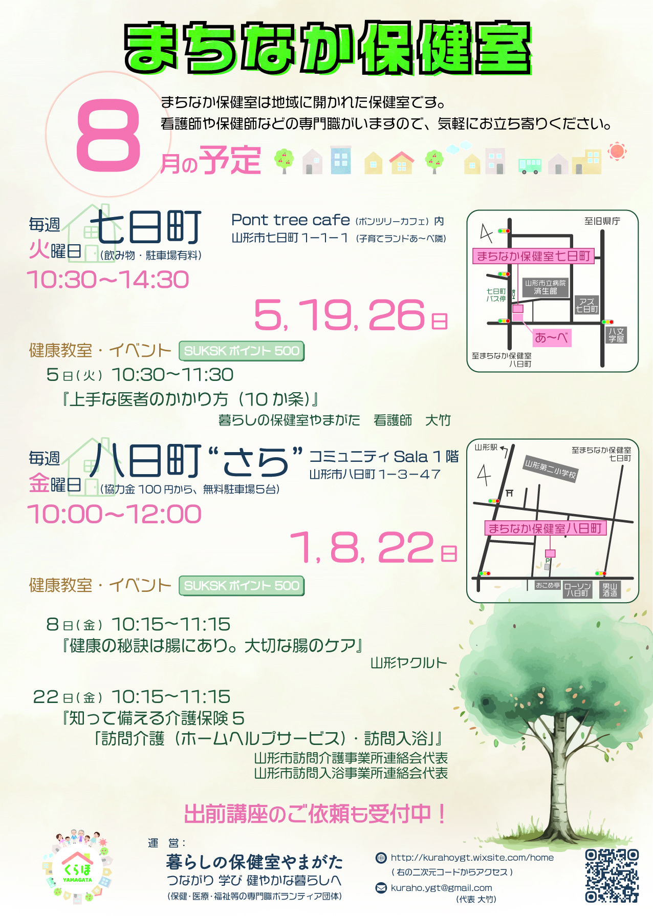 « すべてのイベント このイベントは終了しました。 まちなか保健室七日町 2025年8月26日10:30 - 14:30 « 地域食堂「楽(らく)」 業務改善DX講座 オープンソース ノーコード・ローコードツール「プリザンター®」セミナー » チラシはこちらよりダウンロードできます(PDF形式) + Google カレンダー+ iCal エクスポート 詳細 日付: 2025年8月26日 時間: 10:30 - 14:30 イベントカテゴリー: 団体主催 Web サイト: https://kurahoygt.wixsite.com/home/schedule 主催者 暮らしの保健室やまがた メール: kuraho.ygt @gmail.com Web サイト: https://kurahoygt.wixsite.com/ 会場 Pont tree cafe(ポンツリーカフェ) 山形市七日町1-1-1 + Google マップ