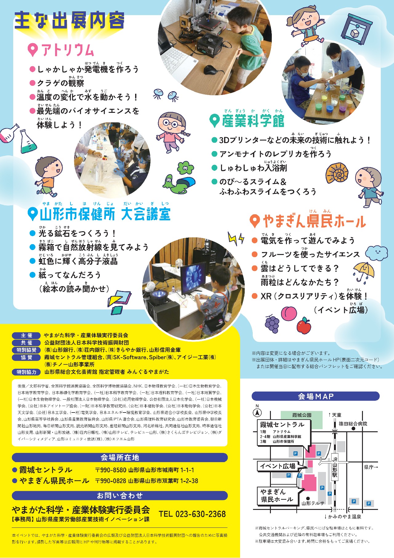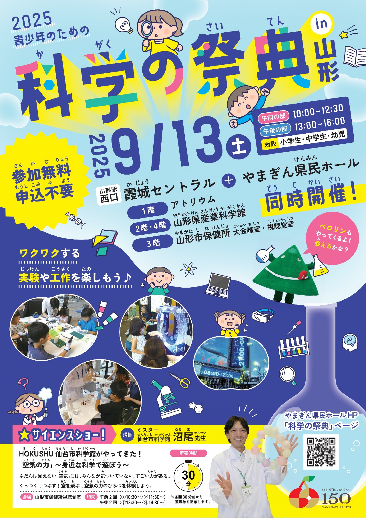 « すべてのイベント このイベントは終了しました。 2025青少年のための科学の祭典in山形 2025年9月13日10:00 - 16:00 無料 « 令和7年度山形県パソコンボランティア養成講座 受講者募集 令和7年度山形県パソコンボランティア養成講座 受講者募集 » チラシはこちら⇒科学の祭典in山形 チラシ(PDF形式) + Google カレンダー+ iCal エクスポート 詳細 日付: 2025年9月13日 時間: 10:00 - 16:00 参加費: 無料 イベントカテゴリー: 団体主催 主催者 山形県産業労働部産業技術イノベーション課 電話番号: 023-630-2368 Web サイト: https://www.pref.yamagata.jp/110002/kensei/shoukai/soshikiannai/shokokanko/110002.html 会場 やまぎん県民ホール 山形市双葉町1-2-38 日本 + Google マップ 電話番号: 023-664-2220