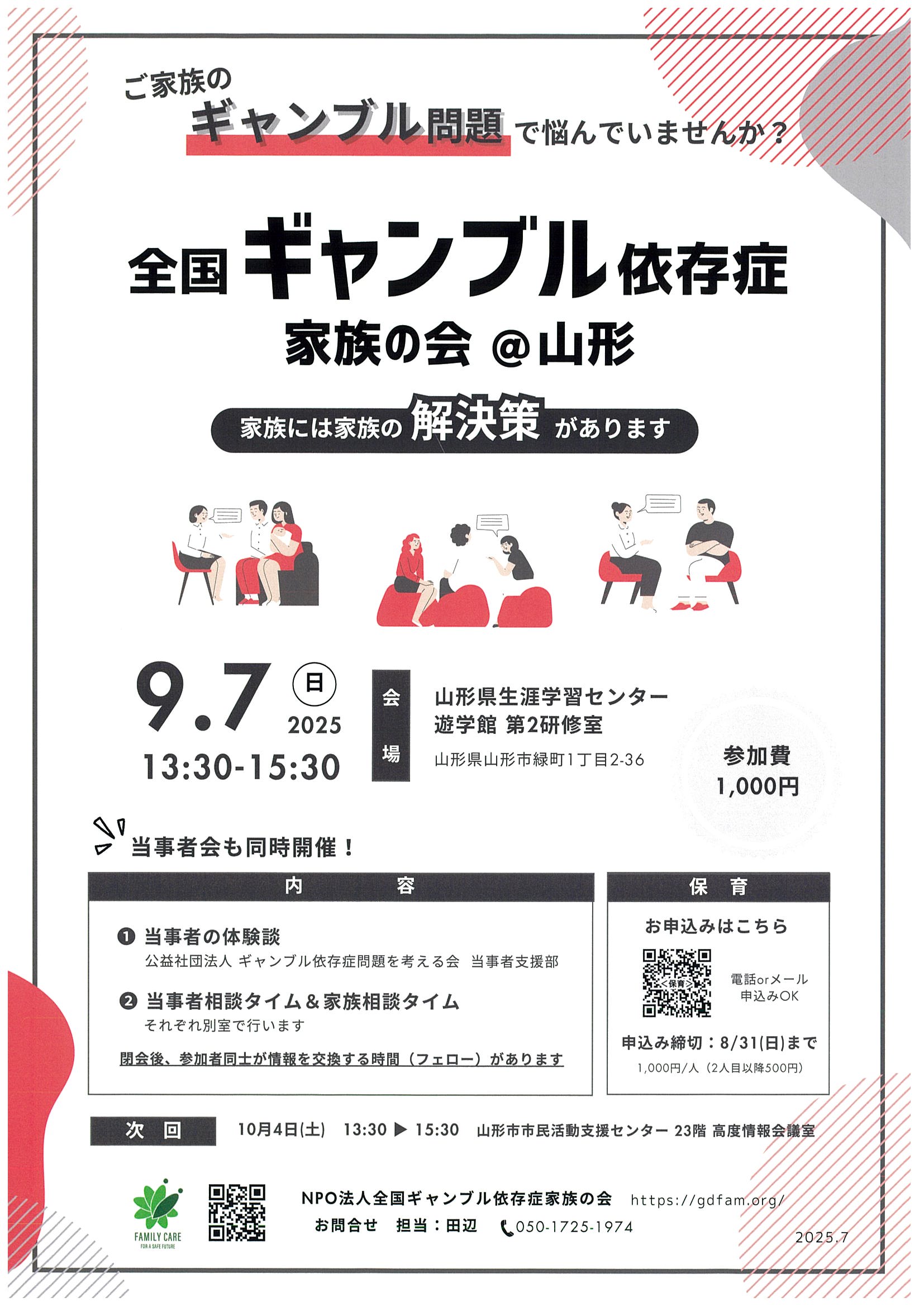 « すべてのイベント このイベントは終了しました。 全国ギャンブル依存症家族の会@山形 2025年9月7日13:30 - 15:30 1,000円 « 令和7年度地域支え合い講座【一般編】 全国ギャンブル依存症当事者の会@山形 » チラシはこちら⇒全国ギャンブル依存症家族の会@山形(PDF形式) + Google カレンダー+ iCal エクスポート 詳細 日付: 2025年9月7日 時間: 13:30 - 15:30 参加費: 1,000円 イベントカテゴリー: 団体主催 主催者 NPO法人全国ギャンブル依存症家族の会 電話番号: 050-1725-8337 Web サイト: https://gdfam.org/ 会場 山形県生涯学習センター 遊学館 第2研修室 山形県山形市緑町1丁目2-36 + Google マップ