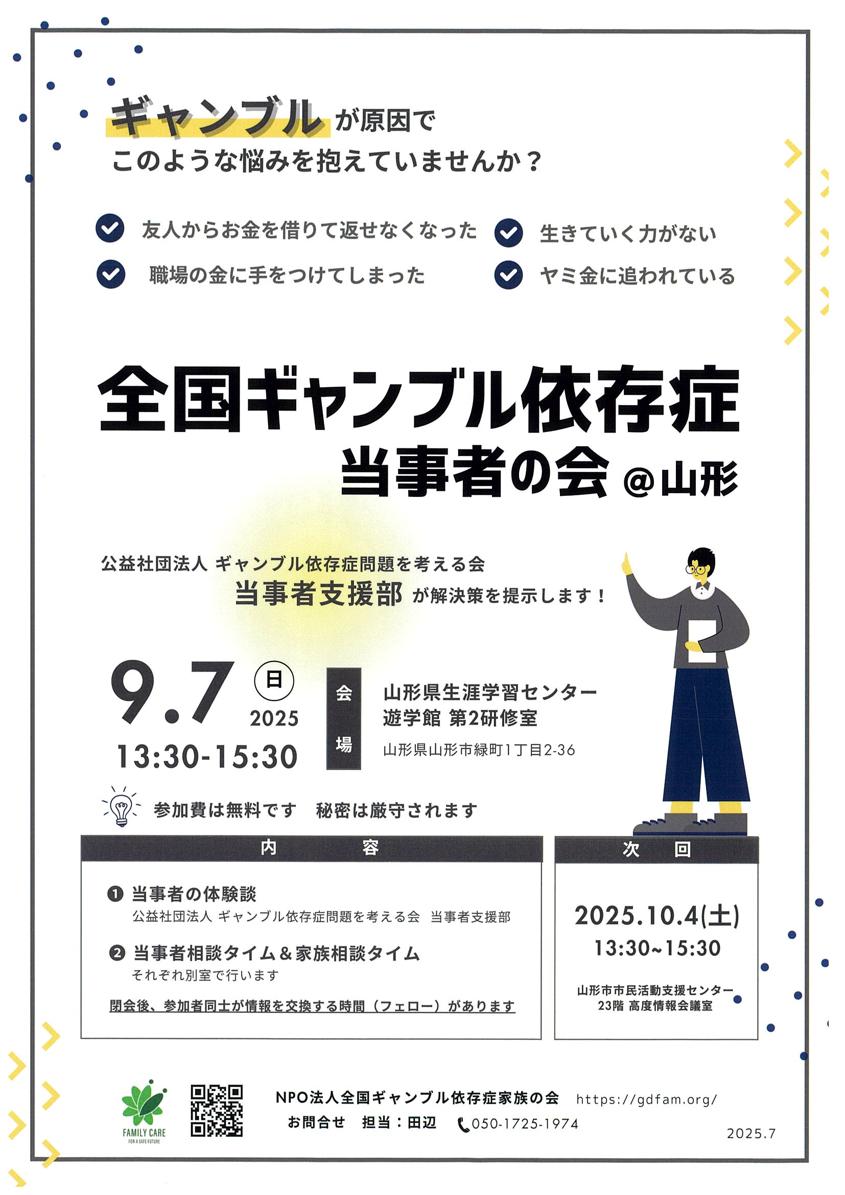 « すべてのイベント このイベントは終了しました。 全国ギャンブル依存症当事者の会@山形 2025年9月7日13:30 - 15:30 無料 « 全国ギャンブル依存症家族の会@山形 婚活セミナー良縁塾のご案内 結婚幸せつかもう! » チラシはこちら⇒全国ギャンブル依存症当事者の会@山形(PDF形式) + Google カレンダー+ iCal エクスポート 詳細 日付: 2025年9月7日 時間: 13:30 - 15:30 参加費: 無料 イベントカテゴリー: 団体主催 主催者 NPO法人全国ギャンブル依存症家族の会 電話番号: 080-3123-2100 Web サイト: https://gdfam.org/ 会場 山形県生涯学習センター 遊学館 第2研修室 山形県山形市緑町1丁目2-36 + Google マップ