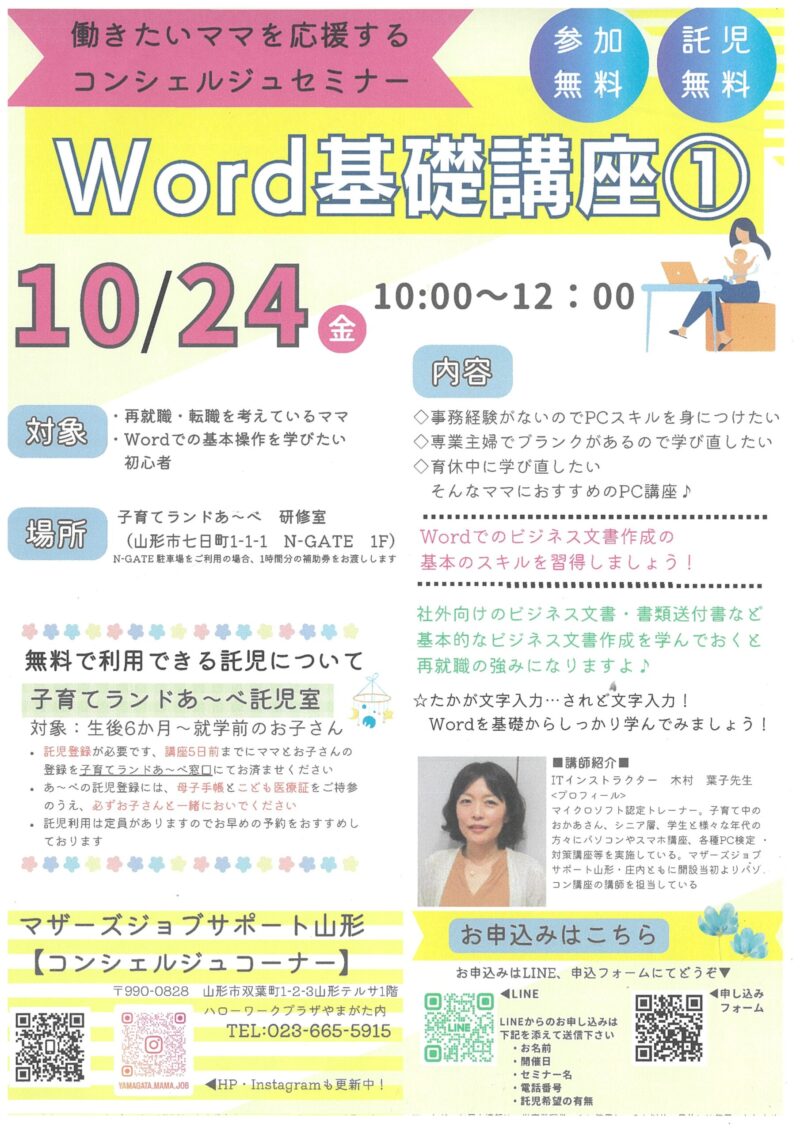 « すべてのイベント このイベントは終了しました。 働きたいママを応援するコンシェルジュセミナー Word基礎講座① 2025年10月24日10:00 - 12:00 « 外国人介護人材受け入れに係る説明会 まちなか保健室八日町”さら” » チラシのダウンロードはこちらから(PDF) + Google カレンダー+ iCal エクスポート 詳細 日付: 2025年10月24日 時間: 10:00 - 12:00 イベントカテゴリー: 団体主催 Web サイト: https://m-job.yamagata.jp/log/?l=551616 主催者 マザーズジョブサポート山形 電話番号: 023-665-5915 Web サイト: http://m-job.yamagata.jp/ 会場 子育てランドあ~べ 研修室 七日町1-1-1 山形市, 山形県 9900042 日本 + Google マップ 電話番号: 023-615-1950