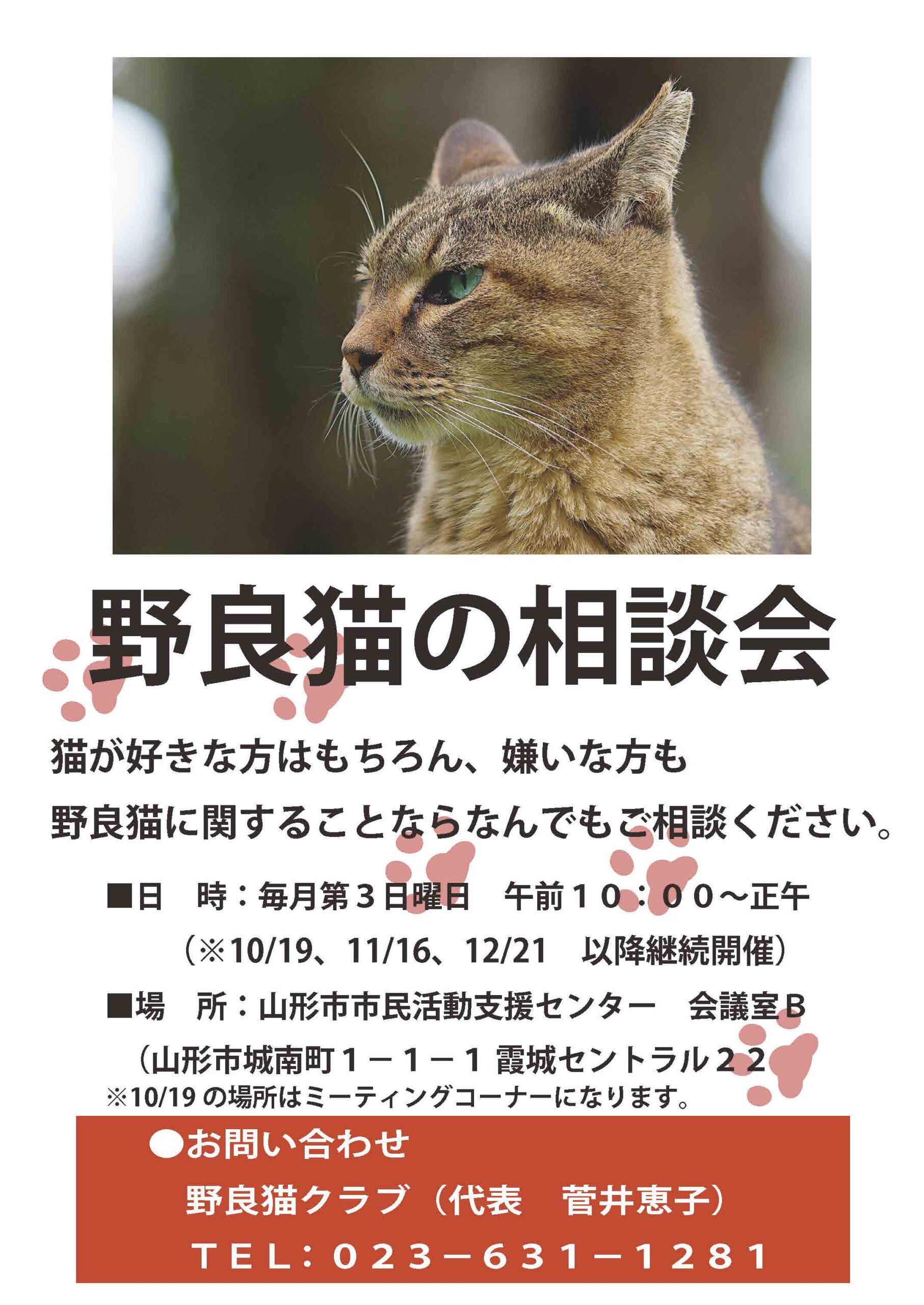 « すべてのイベント 野良猫の相談会 11月 16日10:00 - 12:00 無料 « 令和7年度【村山地区】視覚障がい者ICT講習講座のご案内 蔵王の樹氷について学ぼう » このチラシはこちらからダウンロードできます。(pdf形式) + Google カレンダー+ iCal エクスポート 詳細 日付: 11月 16日 時間: 10:00 - 12:00 参加費: 無料 イベントカテゴリー: 団体主催 主催者 野良猫クラブ 電話番号: 023-631-1281 会場 山形市市民活動支援センター 会議室B 城南町1-1-1 山形市, 山形県 日本 + Google マップ