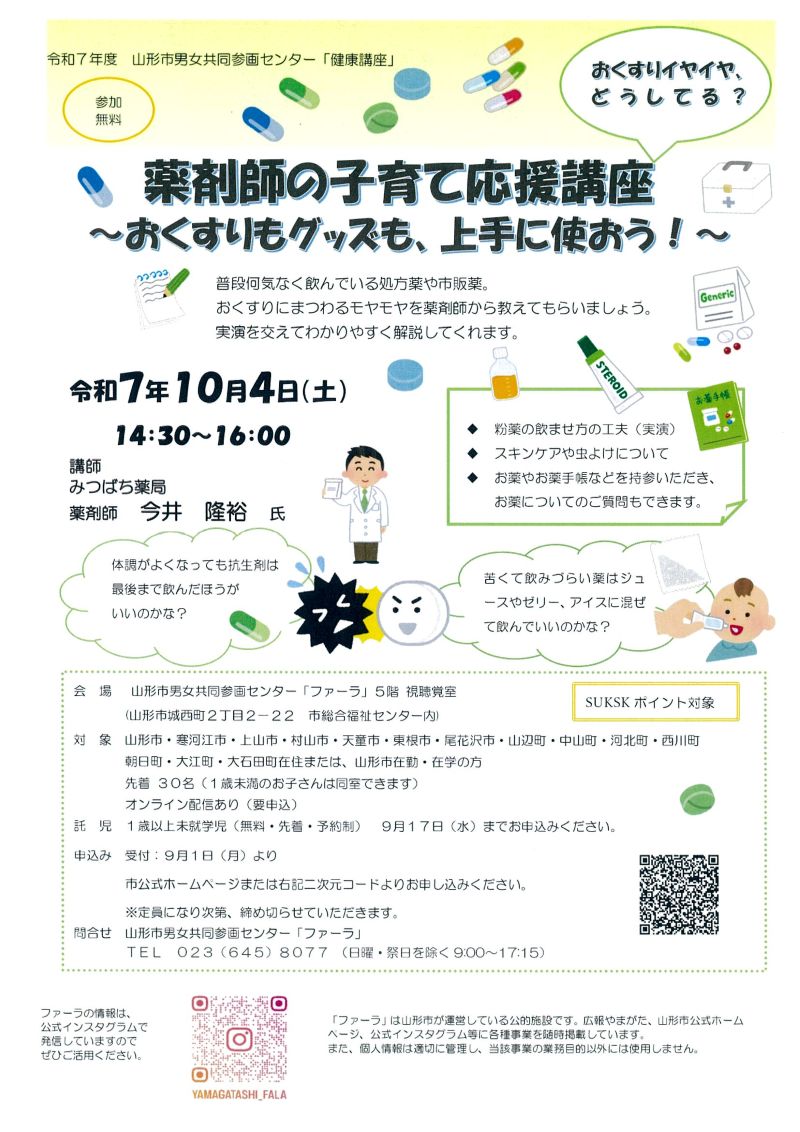 « すべてのイベント このイベントは終了しました。 薬剤師の子育て応援講座~おくすりもグッズも、上手に使おう!~ 2025年10月4日14:30 - 16:00 « 全国ギャンブル依存症家族の会@山形 ロボットカー制作とプログラミング講習会 » チラシはこちらよりダウンロードできます(PDF形式) + Google カレンダー+ iCal エクスポート 詳細 日付: 2025年10月4日 時間: 14:30 - 16:00 イベントカテゴリー: 団体主催 主催者 山形市男女共同参画センター ファーラ 電話番号: 023-645-8077 会場 山形市男女共同参画センター ファーラ 5階 視聴覚室 山形県山形市城西町2-2-22 山形市総合福祉センター内 山形市, 山形県 9900832 日本 + Google マップ