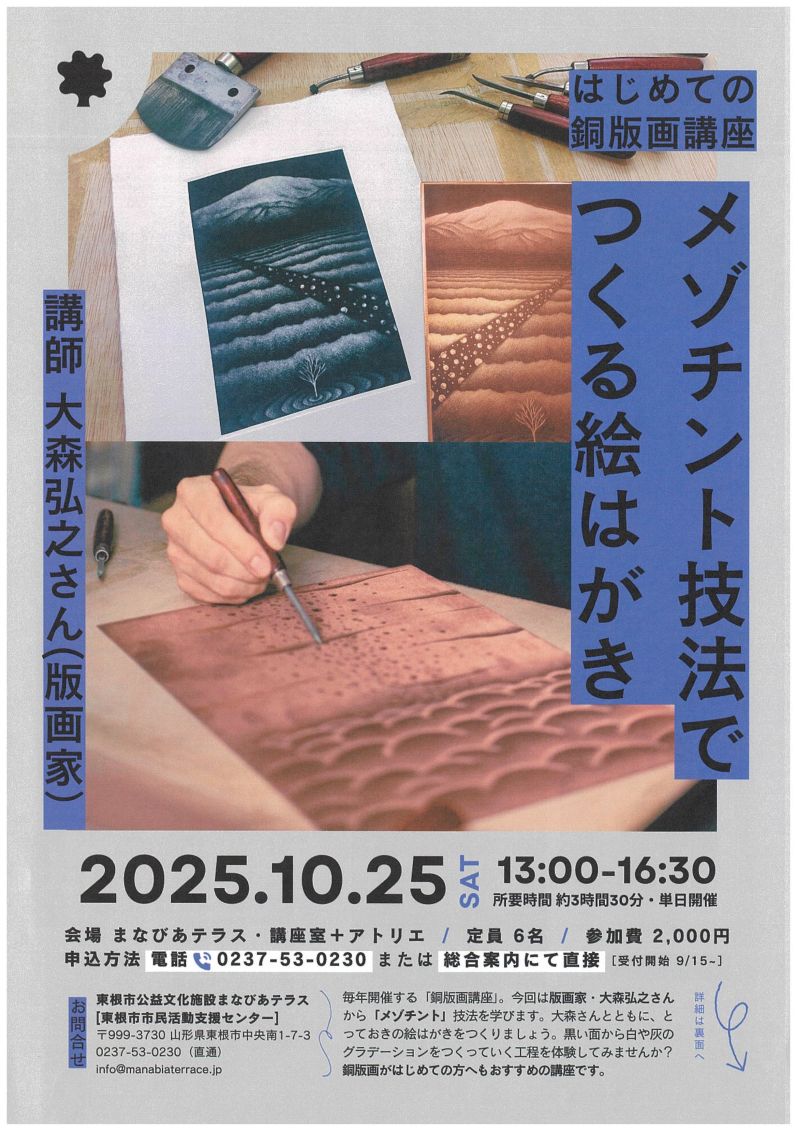« すべてのイベント このイベントは終了しました。 はじめての銅版画講座 メゾチント技法でつくる絵はがき 2025年10月25日13:00 - 16:30 « 公益社団法人「認知症の人と家族の会」山形県支部 山形のつどい 大人のための科学工作 DIYで我が家発電所をつくろう! » チラシはこちらよりダウンロードできます(PDF形式) + Google カレンダー+ iCal エクスポート 詳細 日付: 2025年10月25日 時間: 13:00 - 16:30 イベントカテゴリー: 団体主催 主催者 東根市市民活動支援センター 電話番号: 0237-53-0230 Web サイト: https://www.manabiaterrace.jp/support-center/ 会場 まなびあテラス・講座室+アトリエ 東根市中央南1-7-3 + Google マップ Web サイト: https://www.manabiaterrace.jp/