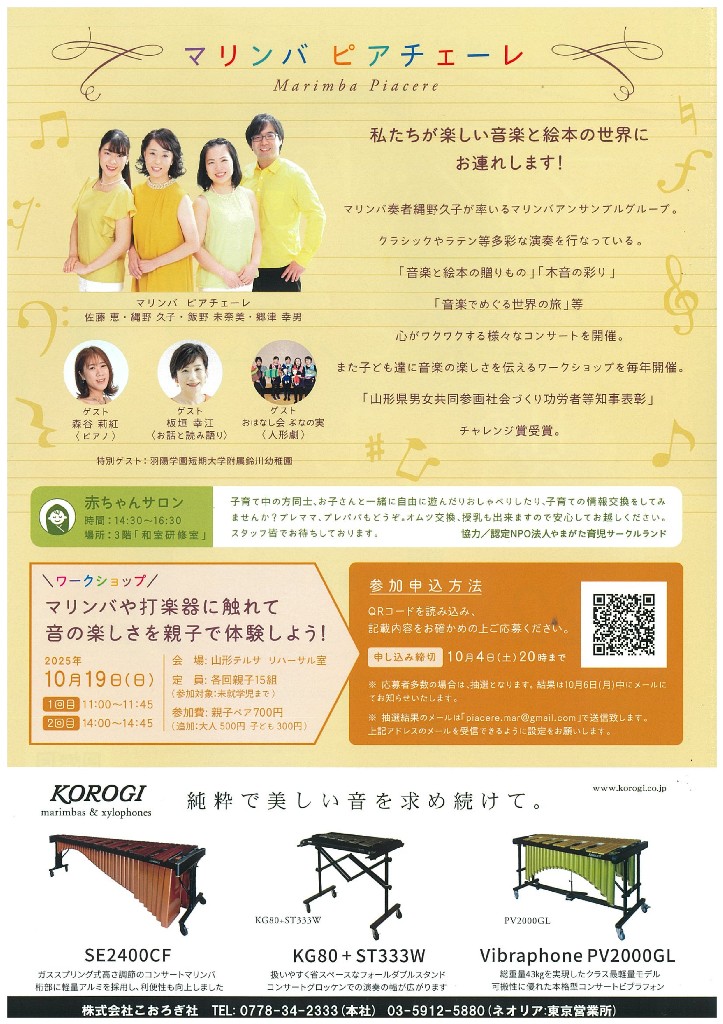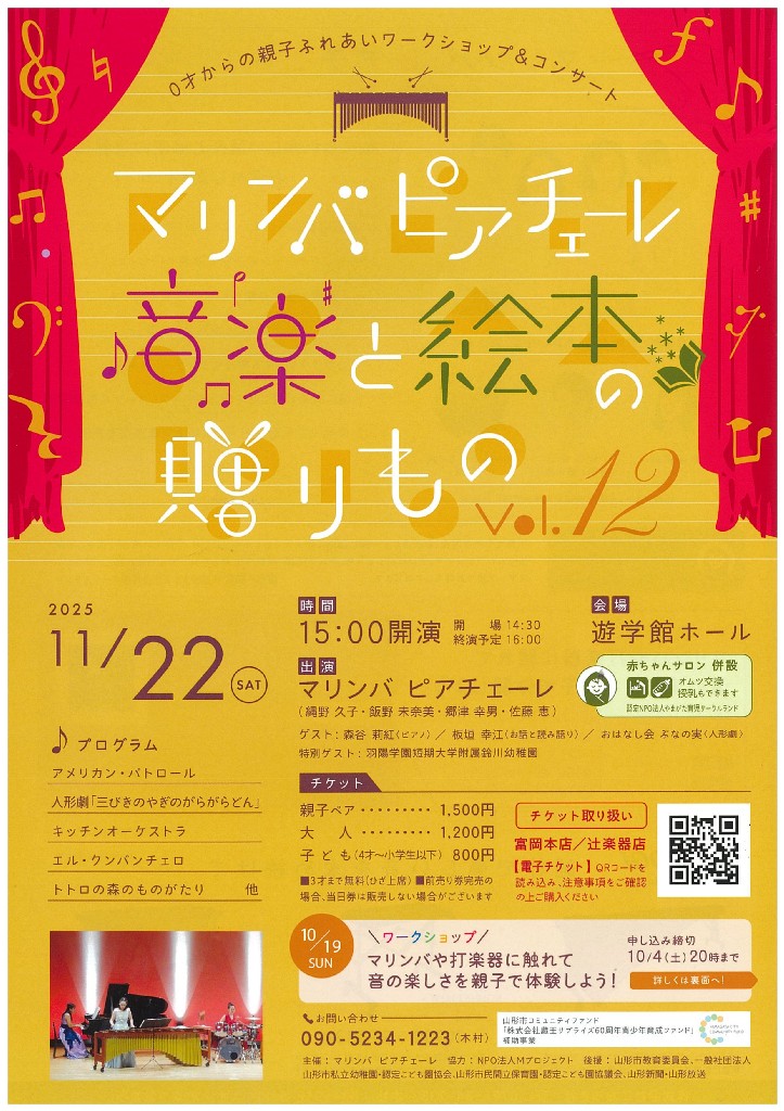 « すべてのイベント マリンバ ピアチェーレ 音楽と絵本の贈りもの 11月 22日15:00 - 16:00 « 社会人講談師 織さゆの「辻講談」(山形霞城会 水野元宣に集う) Sisterhood連続講座2025【第3期】「ハラスメントを考える」第3回 » ■チケット:親子ペア 1,500円 大人 1,200円 子ども(4才~小学生以下) 800円 ※3才まで無料(ひざ上席) チラシはこちら→音楽と絵本の贈りもの(PDF形式) + Google カレンダー+ iCal エクスポート 詳細 日付: 11月 22日 時間: 15:00 - 16:00 イベントカテゴリー: 団体主催 主催者 マリンバ ピアチェーレ 電話番号: 090-5234-1223(木村) 会場 山形県生涯学習センター遊学館 緑町1-2-36 山形市, 山形県 9900041 + Google マップ
