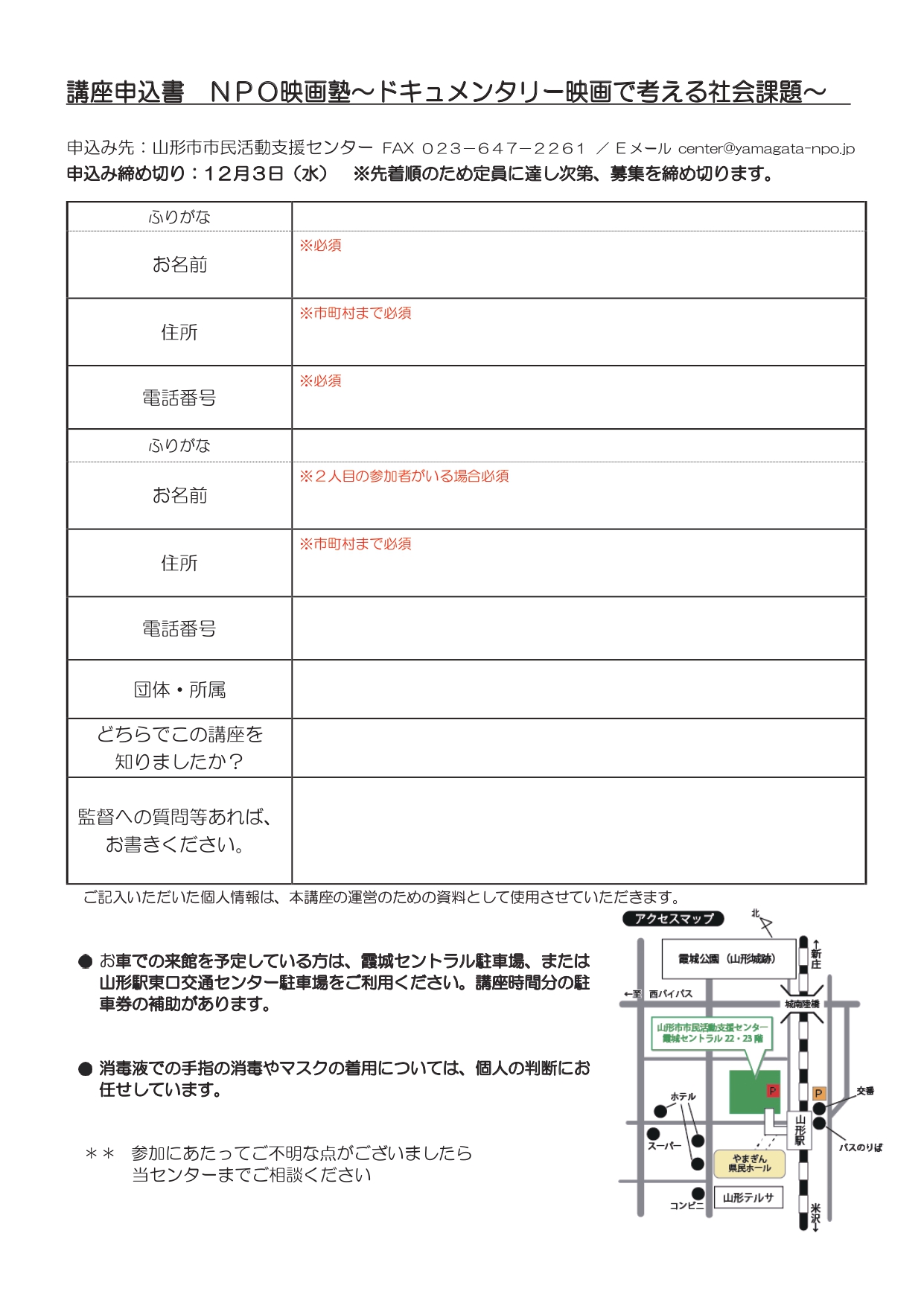« すべてのイベント このイベントは終了しました。 NPO映画塾~ドキュメンタリー映画で考える社会課題~ 2025年12月6日18:00 - 20:00 無料 « かたばみの会deランチを楽しみましょう やまがたNPOウイーク2025 12月7日開催!ステージ発表&団体の活動紹介 » チラシ(PDF)はこちらから 申込みは下記Googleフォームから(11/1より開始) https://forms.gle/ihQ5uFtQmgu4siph8 + Google カレンダー+ iCal エクスポート 詳細 日付: 2025年12月6日 時間: 18:00 - 20:00 参加費: 無料 イベントカテゴリー: センター主催 主催者 山形市市民活動支援センター 電話番号: 023-647-2260 メール: center@yamagata-npo.jp 会場 山形市市民活動支援センター 23階 高度情報会議室 山形市城南町1-1-1 霞城セントラル23階 山形市, 山形県 9908580 日本 + Google マップ