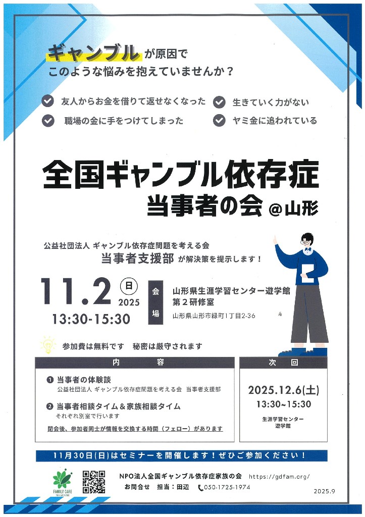« すべてのイベント このイベントは終了しました。 全国ギャンブル依存症 当事者の会@山形 11月 2日13:30 - 15:30 無料 « 第4回やまがたカラフルパレード 全国ギャンブル依存症 家族の会@山形 » チラシはこちら⇒当事者の会@山形(PDF形式) + Google カレンダー+ iCal エクスポート 詳細 日付: 11月 2日 時間: 13:30 - 15:30 参加費: 無料 イベントカテゴリー: 団体主催 主催者 NPO法人全国ギャンブル依存症家族の会 電話番号: 080-3123-2100 Web サイト: https://gdfam.org/ 会場 山形県生涯学習センター遊学館 緑町1-2-36 山形市, 山形県 9900041 + Google マップ