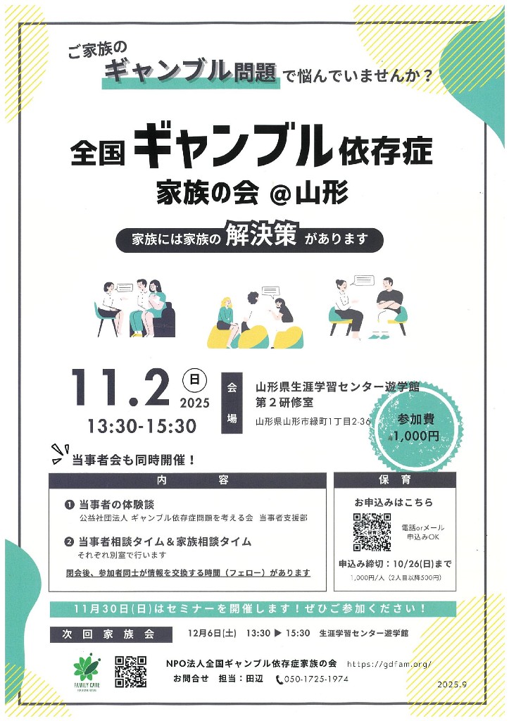 « すべてのイベント このイベントは終了しました。 全国ギャンブル依存症 家族の会@山形 11月 2日13:30 - 15:30 1,000円 « 全国ギャンブル依存症 当事者の会@山形 映画「素晴らしき哉、人生!」ユニバーサル上映会 » チラシはこちら⇒家族の会@山形(PDF形式) + Google カレンダー+ iCal エクスポート 詳細 日付: 11月 2日 時間: 13:30 - 15:30 参加費: 1,000円 イベントカテゴリー: 団体主催 主催者 NPO法人全国ギャンブル依存症家族の会 電話番号: 080-3123-2100 Web サイト: https://gdfam.org/ 会場 山形県生涯学習センター遊学館 緑町1-2-36 山形市, 山形県 9900041 + Google マップ