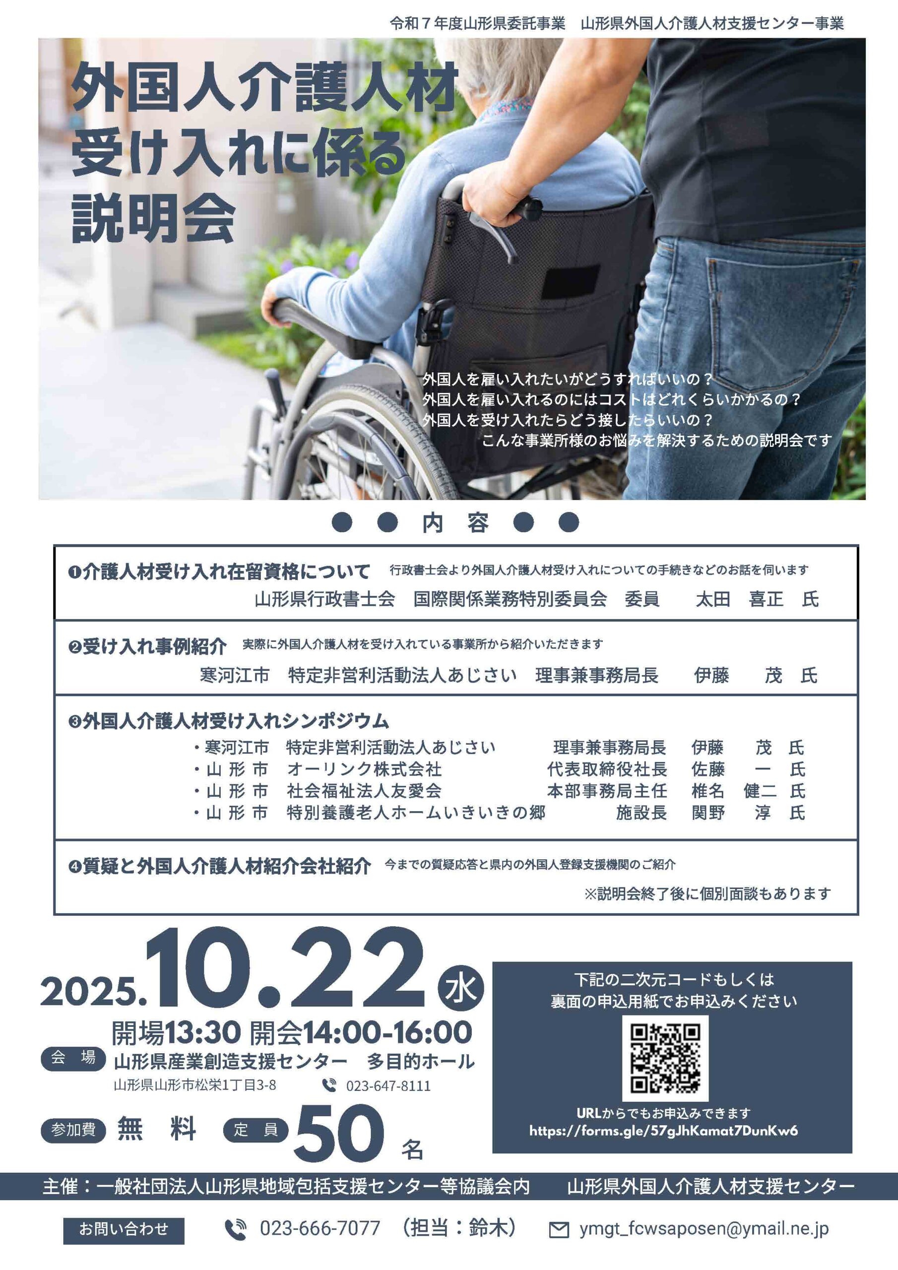 « すべてのイベント このイベントは終了しました。 外国人介護人材受け入れに係る説明会 2025年10月22日14:00 - 16:00 無料 « 木原ガイド塾 旧町名標柱巡り(山形霞城会 水野元宣に集う) 働きたいママを応援するコンシェルジュセミナー Word基礎講座① » このチラシはこちらからダウンロードできます。(PDF) + Google カレンダー+ iCal エクスポート 詳細 日付: 2025年10月22日 時間: 14:00 - 16:00 参加費: 無料 イベントカテゴリー: 団体主催 主催者 山形県外国人介護人材支援センター 電話番号: 023-666-7077 メール: ymgt_fcwsaposen@ymail.ne.jp 会場 山形県産業創造支援センター1階 多目的ホール