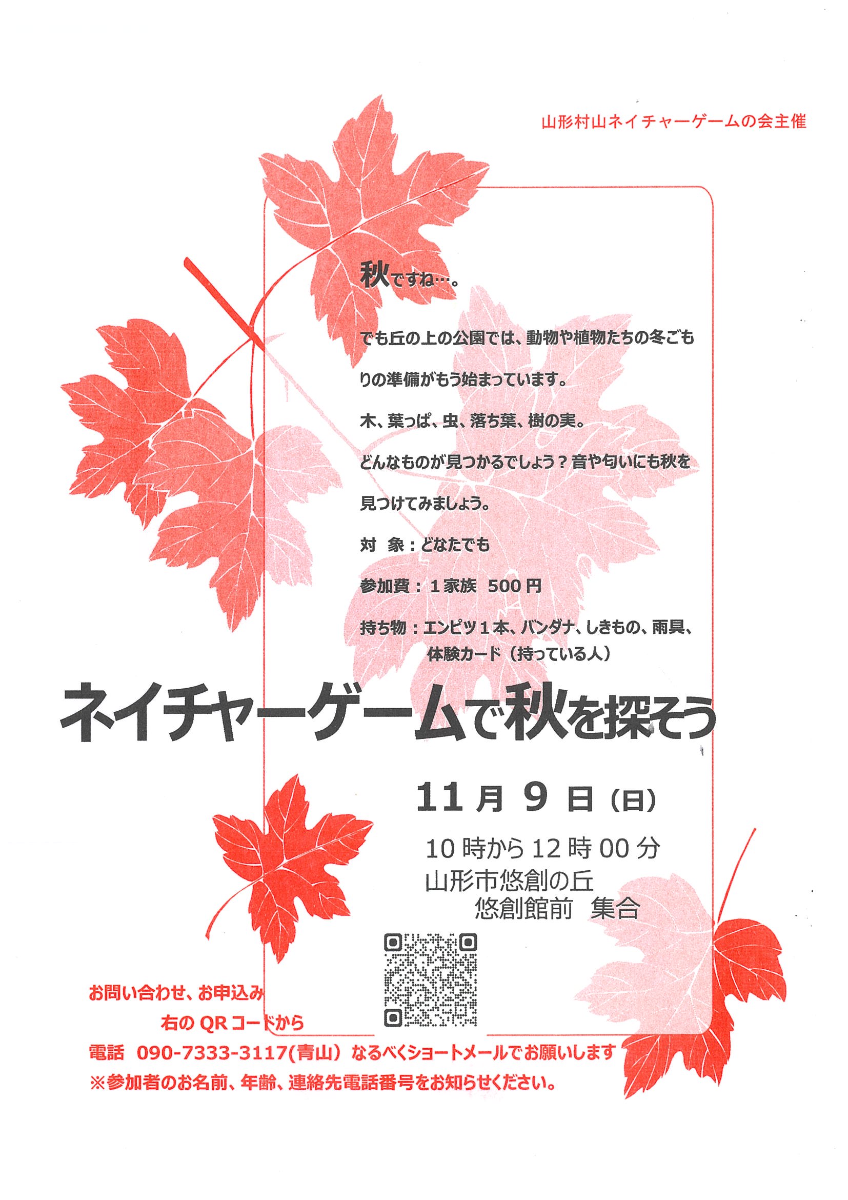 « すべてのイベント ネイチャーゲームで秋を探そう 11月 9日10:00 - 12:00 500円 « 洗心庵 庭園と呈茶を楽しむ会 ロボットカー制作とプログラミング講習会 » チラシはこちら→ネイチャーゲーム(PDF形式) + Google カレンダー+ iCal エクスポート 詳細 日付: 11月 9日 時間: 10:00 - 12:00 参加費: 500円 イベントカテゴリー: 団体主催 主催者 山形村山ネイチャーゲームの会 メール: koutya_pinoco@yahoo.co.jp 会場 山形市悠創の丘 悠創館前 山形県山形市上桜田366 + Google マップ