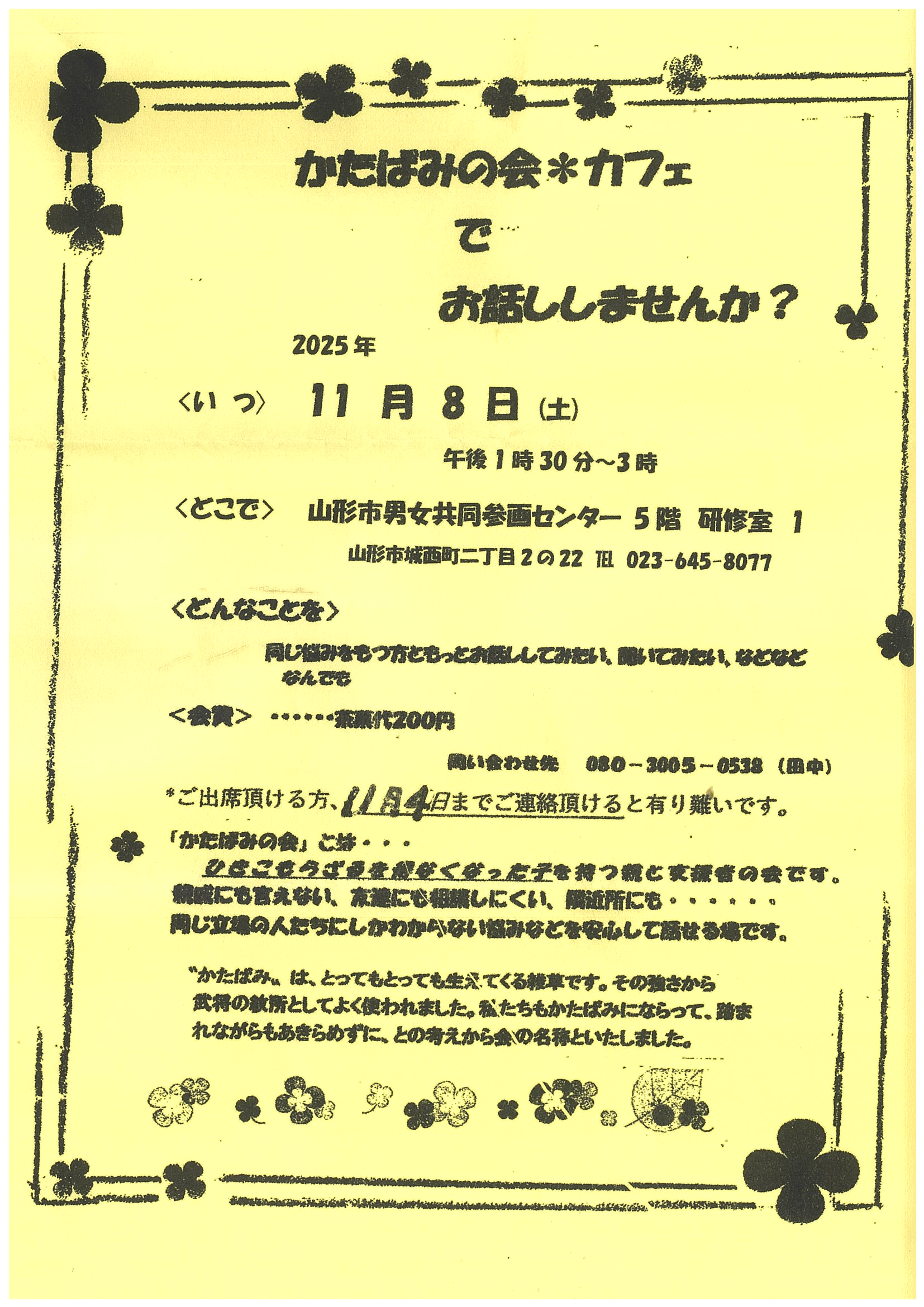 « すべてのイベント かたばみの会カフェ 11月 8日13:30 - 15:00 200円 « 令和7年 古文書解読講座「柴崎五郎八家文書」を読む 第1回 洗心庵 庭園と呈茶を楽しむ会 » チラシはこちら→かたばみの会カフェ(PDF形式) + Google カレンダー+ iCal エクスポート 詳細 日付: 11月 8日 時間: 13:30 - 15:00 参加費: 200円 イベントカテゴリー: 団体主催 主催者 かたばみの会 電話番号: 080-3005-0538 会場 山形市男女共同参画センター ファーラ 5階 研修室1 山形県山形市城南町2-2-22 + Google マップ 電話番号: 023-645-8077