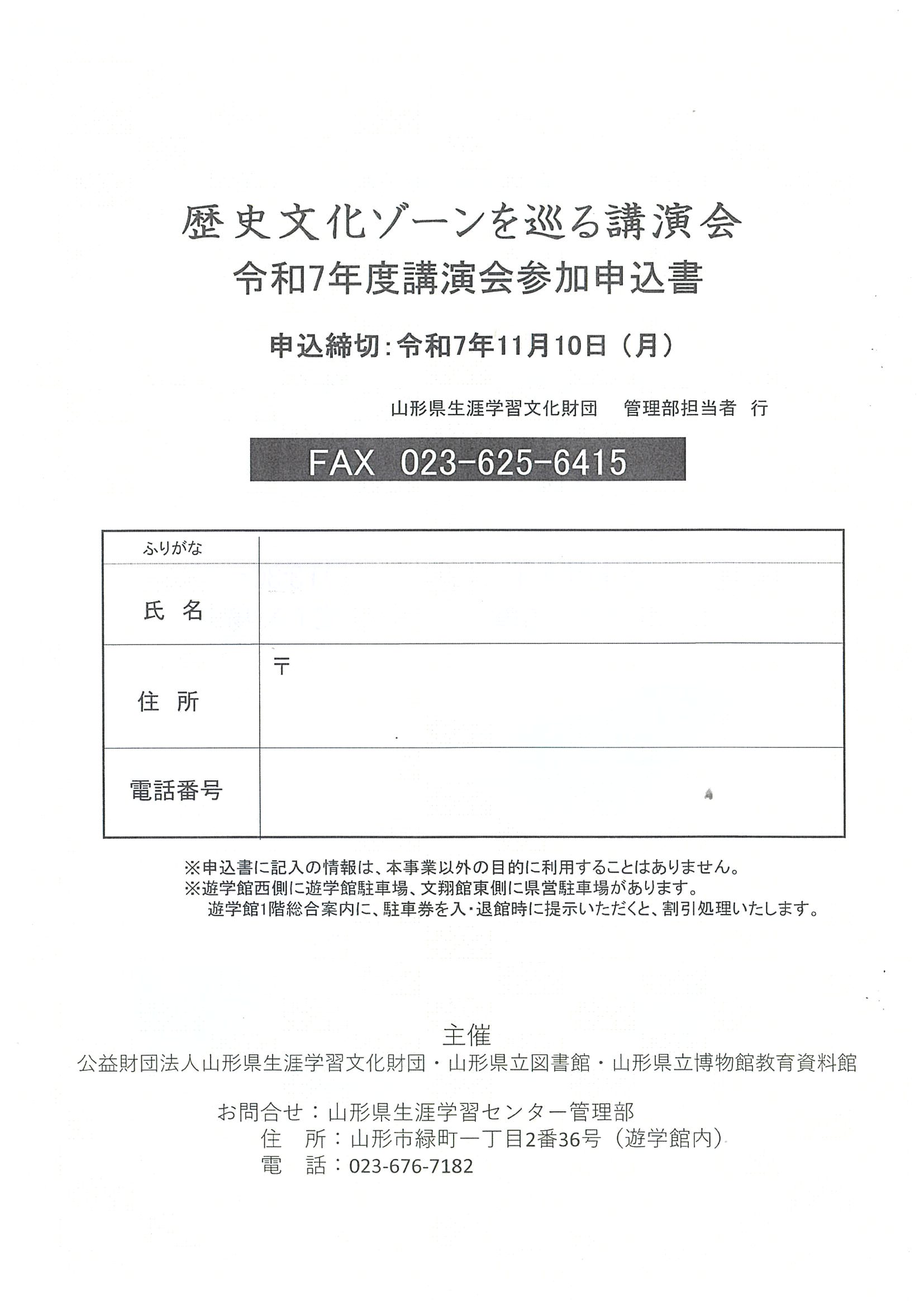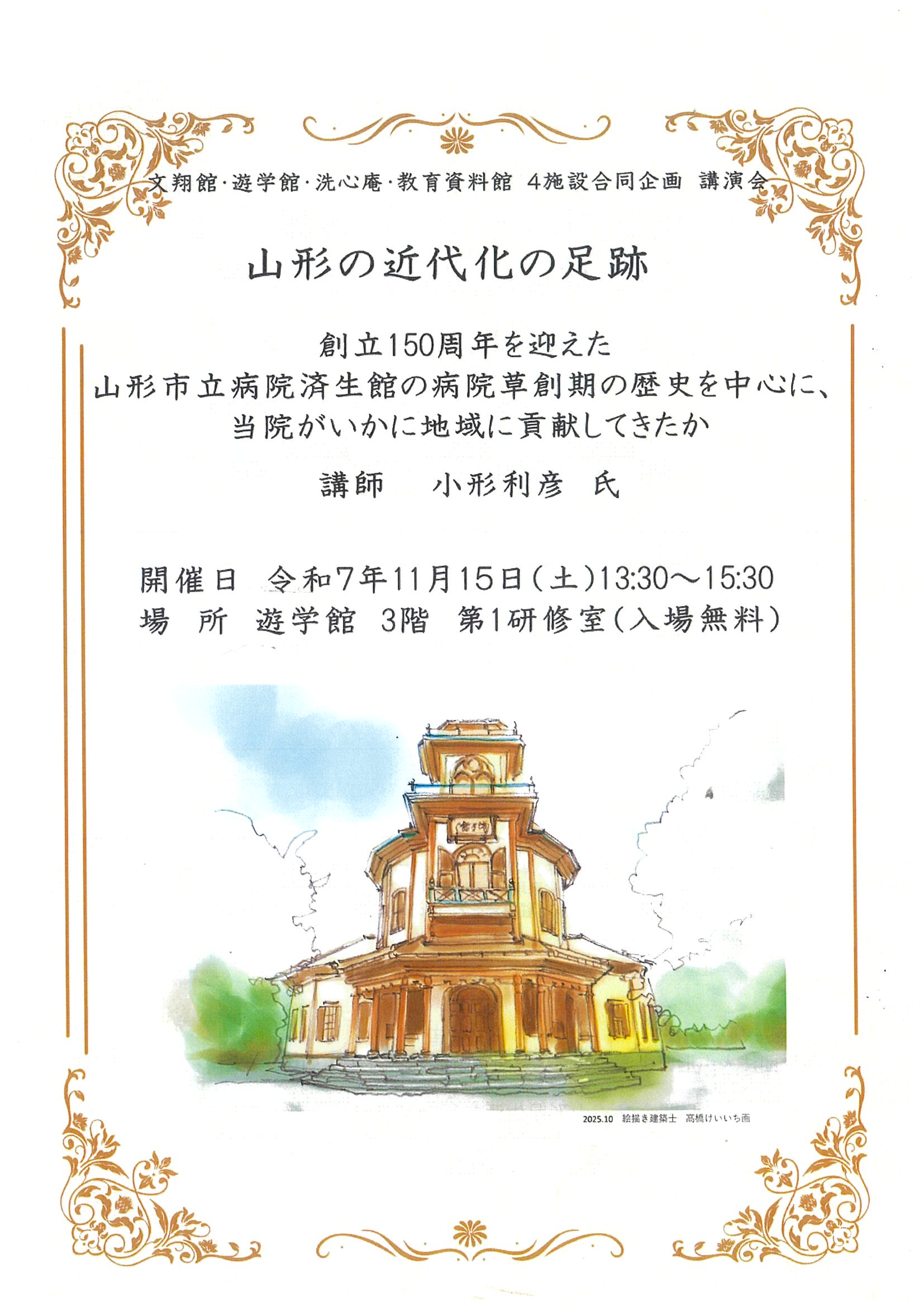 « すべてのイベント 講演会「山形の近代化の足跡」 11月 15日11:30 - 15:30 無料 « 令和7年 古文書解読講座「柴崎五郎八家文書」を読む 第2回 第49回 哲学カフェ 「悩む」ってどういうこと? » チラシはこちら→山形の近代化の足跡(PDF形式) + Google カレンダー+ iCal エクスポート 詳細 日付: 11月 15日 時間: 11:30 - 15:30 参加費: 無料 イベントカテゴリー: 団体主催 主催者 公益財団法人山形県生涯学習文化財団 電話番号: 023-625-6411 メール: yama@gakushubunka.jp 会場 山形県生涯学習センター 遊学館 3階 第1研修室 山形市緑町1丁目2-36 + Google マップ