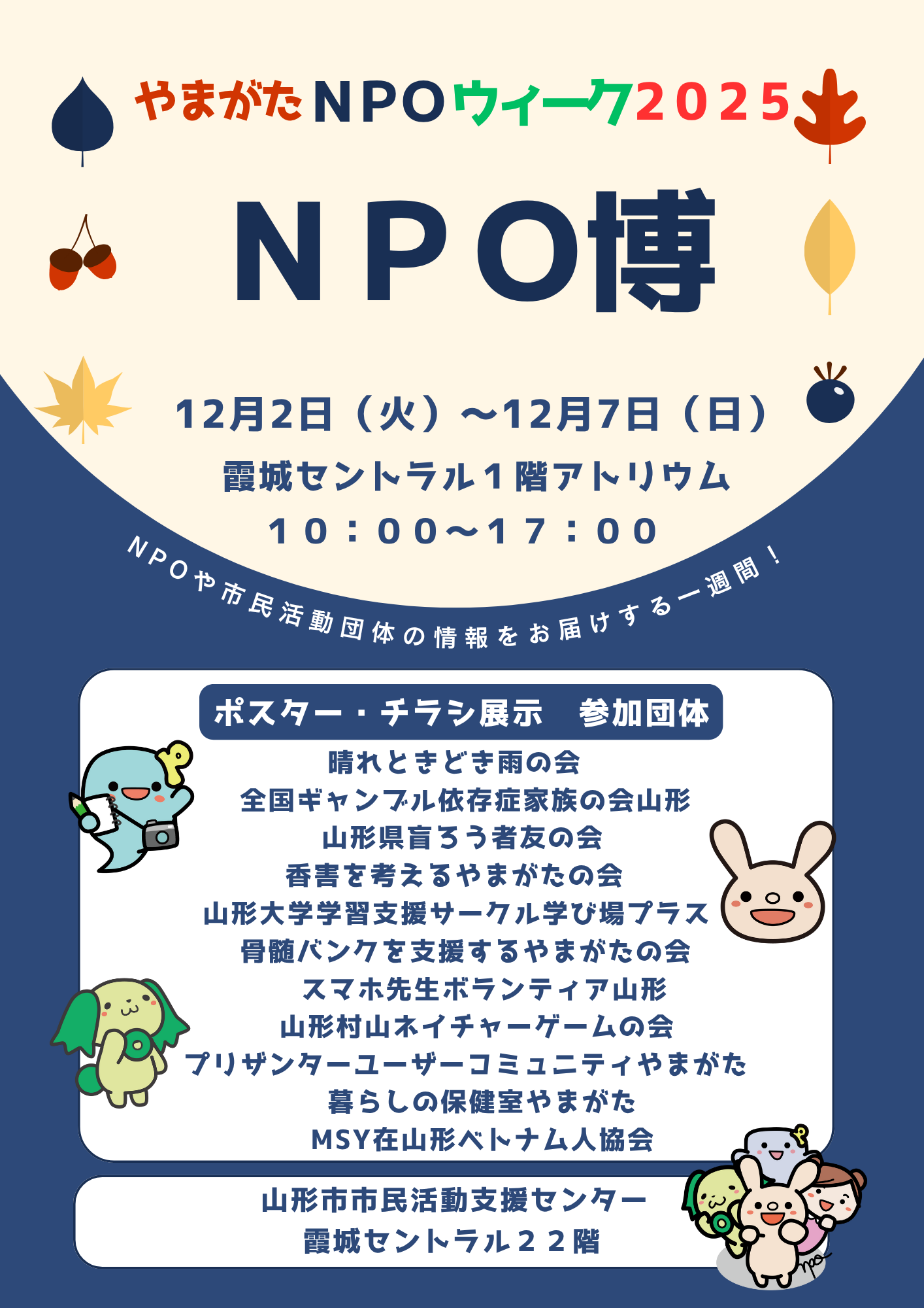 « すべてのイベント やまがたNPOウイーク2025~NPO博~ 12月 2日 - 12月 7日 « 学んでみよう!体験してみよう!子どもに関わる仕事 やまがたNPOウイーク2025 » + Google カレンダー+ iCal エクスポート 詳細 開始: 12月 2日 終了: 12月 7日 イベントカテゴリー: センター主催 主催者 山形市市民活動支援センター 電話番号: 023-647-2260 メール: center@yamagata-npo.jp 会場 山形市城南町1-1-1 霞城セントラル1階アトリウム 城南町1-1-1 山形市, 日本 + Google マップ 電話番号: 023-647-2260