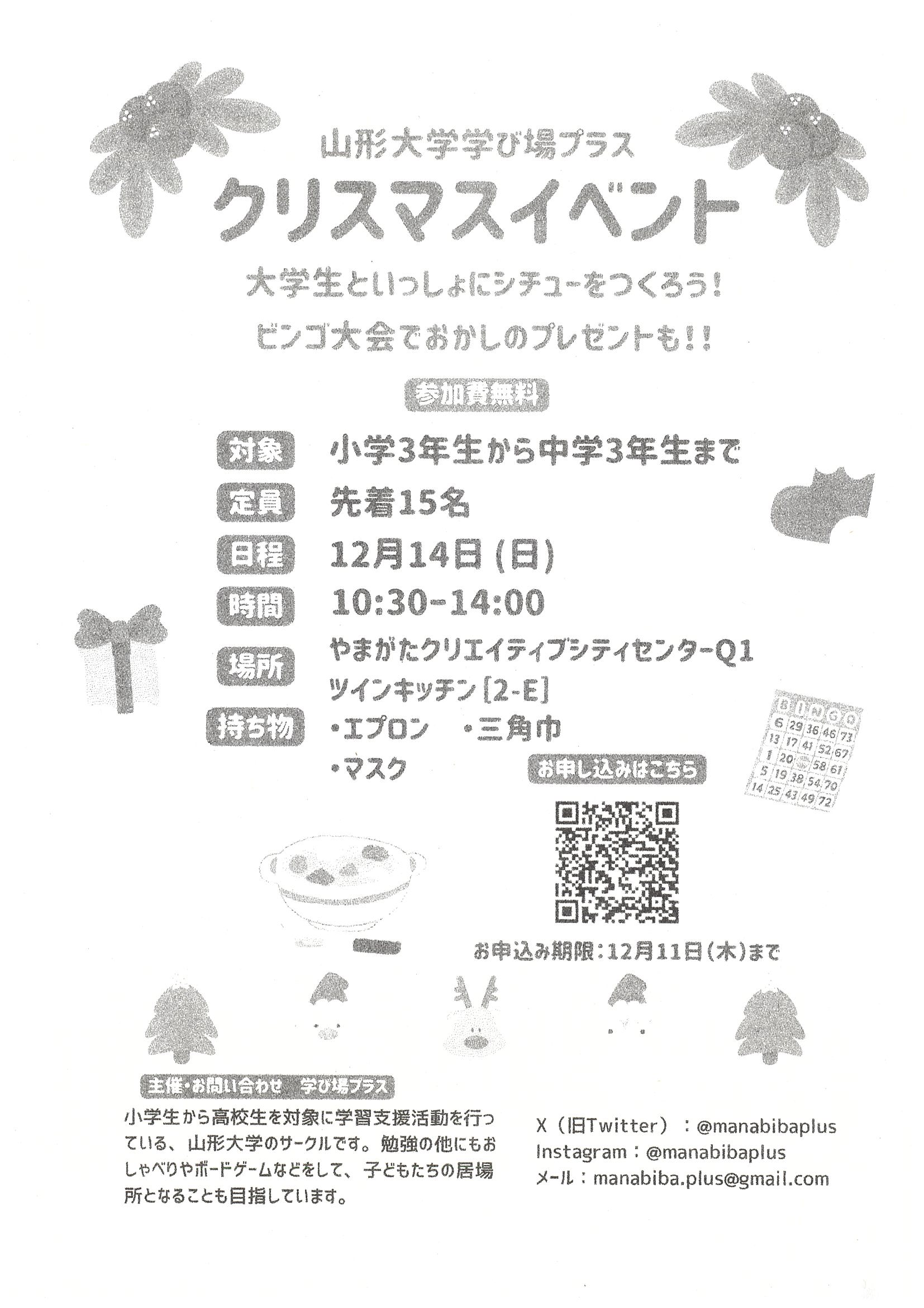 « すべてのイベント このイベントは終了しました。 山形大学学び場プラス クリスマスイベント 2025年12月14日10:30 - 14:00 無料 « 親子ふれあいのつどい~ミニ門松作り&エコ羽子板で遊ぼう~ 信頼を得て共感の輪を広げる! 令和時代のNPOの情報発信 » チラシはこちら→クリスマスイベント(PDF形式) + Google カレンダー+ iCal エクスポート 詳細 日付: 2025年12月14日 時間: 10:30 - 14:00 参加費: 無料 イベントカテゴリー: 団体主催 主催者 学び場プラス 会場 やまがたクリエイティブシティセンターQ1 山形県山形市本町1-5-19 + Google マップ