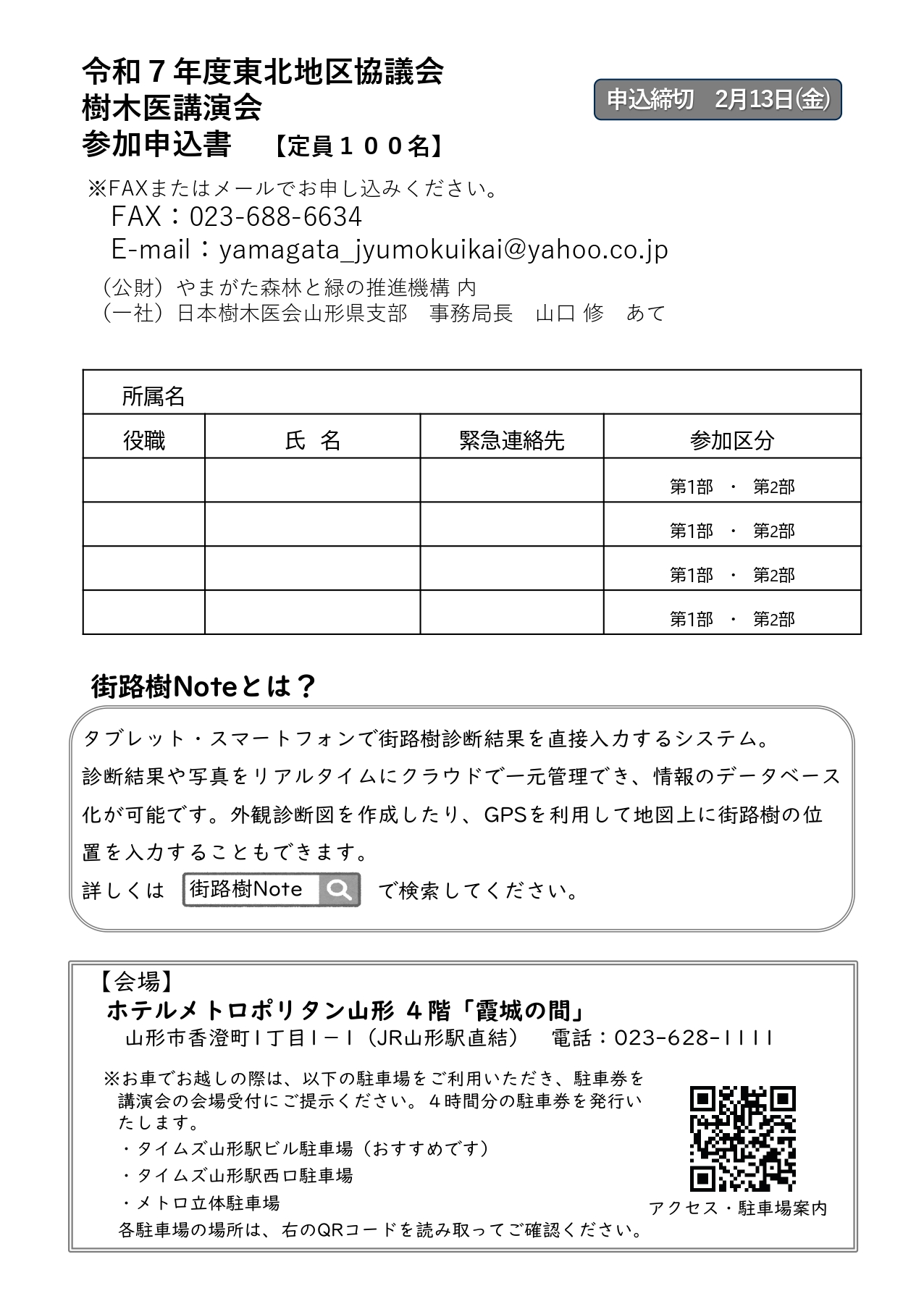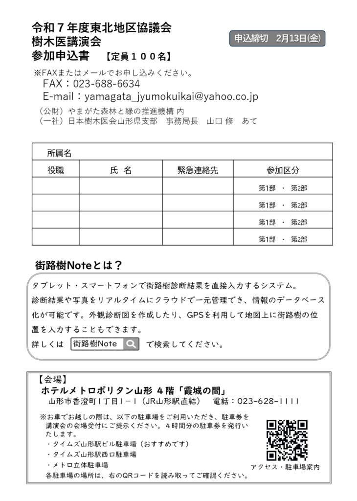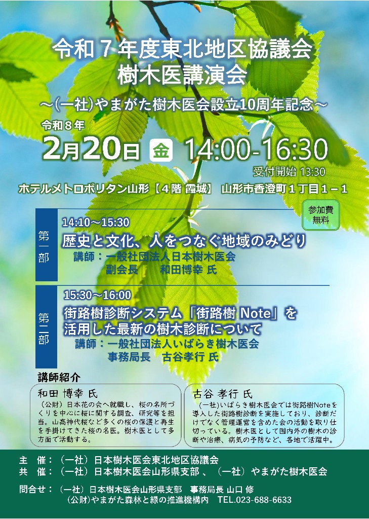 « すべてのイベント このイベントは終了しました。 令和7年度東北地区協議会樹木医講演会 ~(一社)やまがた樹木医会設立10周年記念~ 2月 20日14:00 - 16:30 無料 « みんなのキャンバス アートツリーやまがたVol.14 » チラシ・申込用紙はこちら→東北地区樹木医講演会(PDF形式) + Google カレンダー+ iCal エクスポート 詳細 日付: 2月 20日 時間: 14:00 - 16:30 参加費: 無料 イベントカテゴリー: 団体主催 主催者 (公財)やまがた森林と緑の推進機構 電話番号: 023-688-6633 Web サイト: http://ymidori.or.jp/index.html 会場 ホテルメトロポリタン山形 4階 霞城 山形県山形市香澄町1丁目1−1 + Google マップ