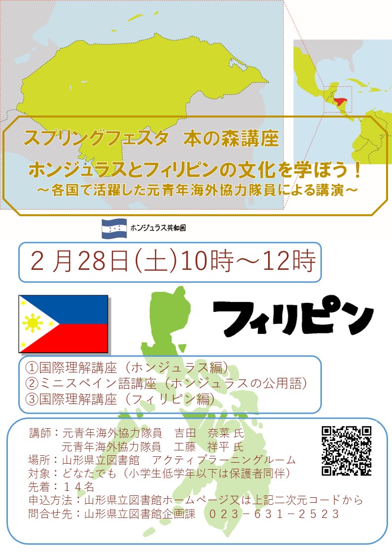 « すべてのイベント このイベントは終了しました。 ホンジャラスとフィリピンの文化を学ぼう!~各国で活躍した元青年海外協力隊員による講演~ 2月 28日10:00 - 12:00 « アートツリーやまがたVol.14 おしゃべりアート鑑賞ワークショップ » チラシはこちらから(PDF) + Google カレンダー+ iCal エクスポート 詳細 日付: 2月 28日 時間: 10:00 - 12:00 イベントカテゴリー: 団体主催 主催者 山形県立図書館 電話番号: 023-631-2523 会場 山形県立図書館 1階 アクティブラーニングルーム 緑町1-2-36 山形市, 990-0041 + Google マップ 電話番号: 023-631-2523