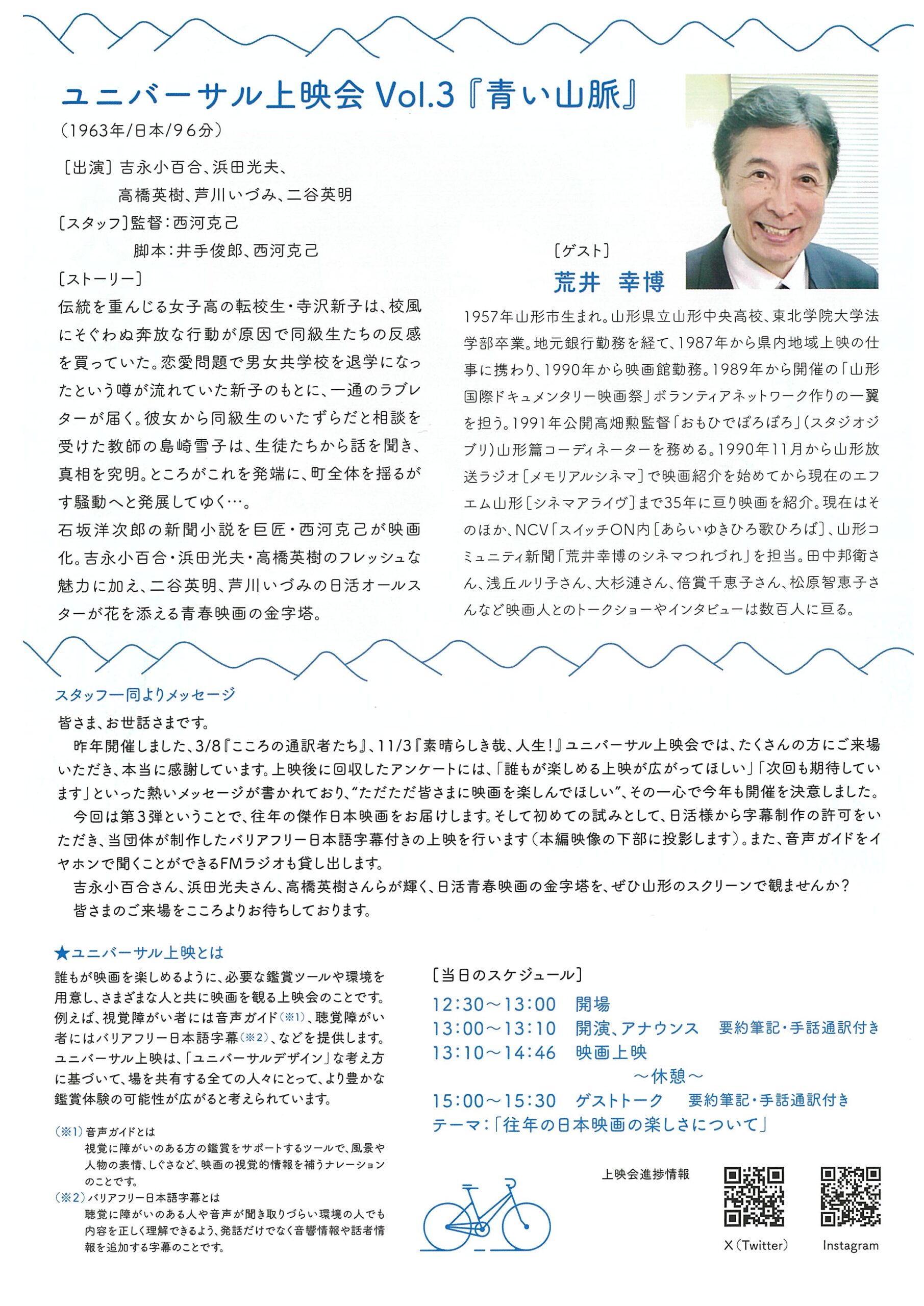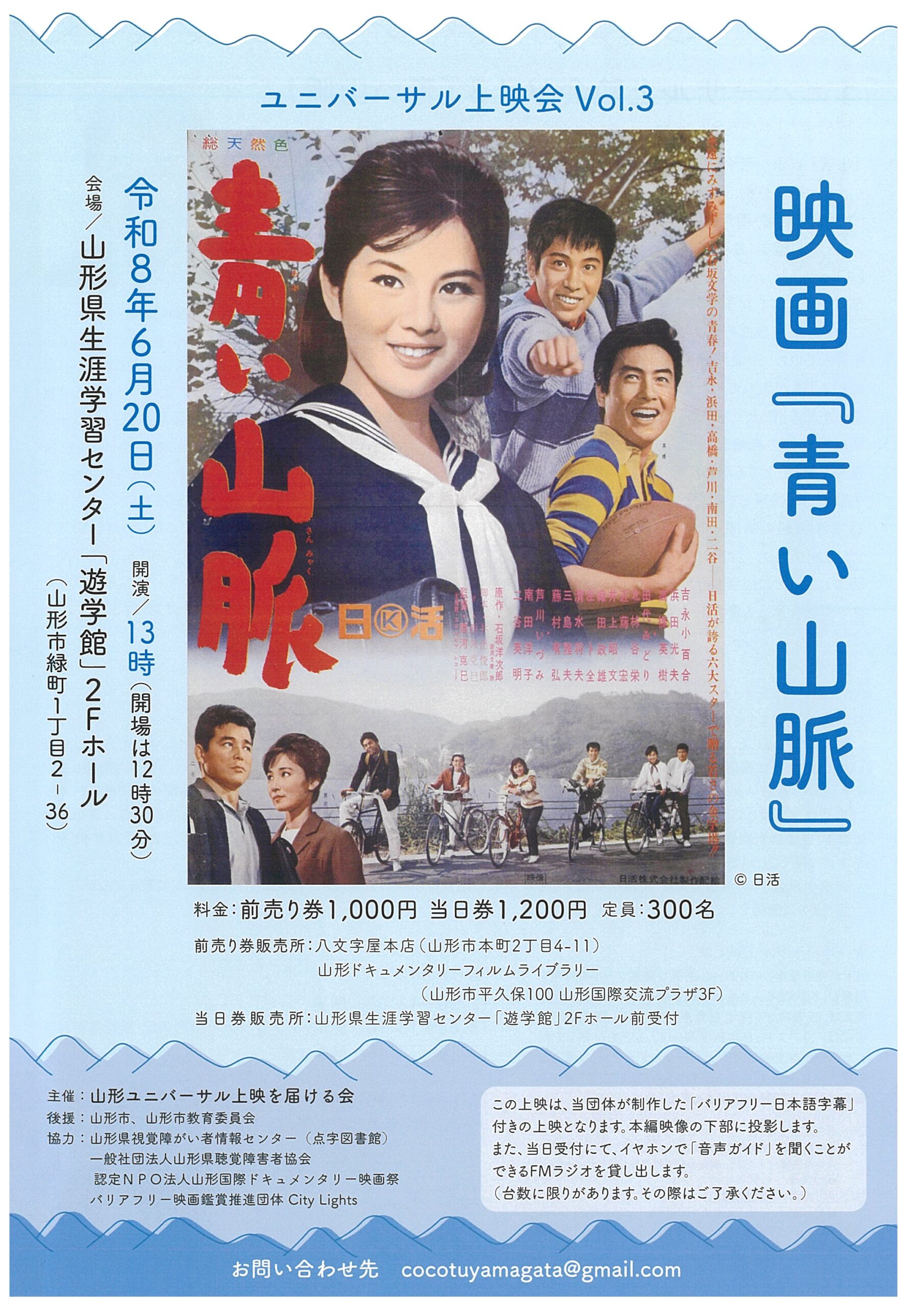 « すべてのイベント ユニバーサル上映会Vol.3映画『青い山脈』 6月 20日12:30 - 15:30 有料 « あなたも「とぴボラ」してみませんか? すみれ会の「お徳カフェ」 » チラシはこちらから(PDF) + Google カレンダー+ iCal エクスポート 詳細 日付: 6月 20日 時間: 12:30 - 15:30 参加費: 有料 イベントカテゴリー: 団体主催 主催者 山形ユニバーサル上映を届ける会 メール: cocotuyamagata@gmail.com 会場 山形県生涯学習センター 遊学館 2Fホール 緑町1丁目2ー26 山形市, + Google マップ 電話番号: 023-625-6411