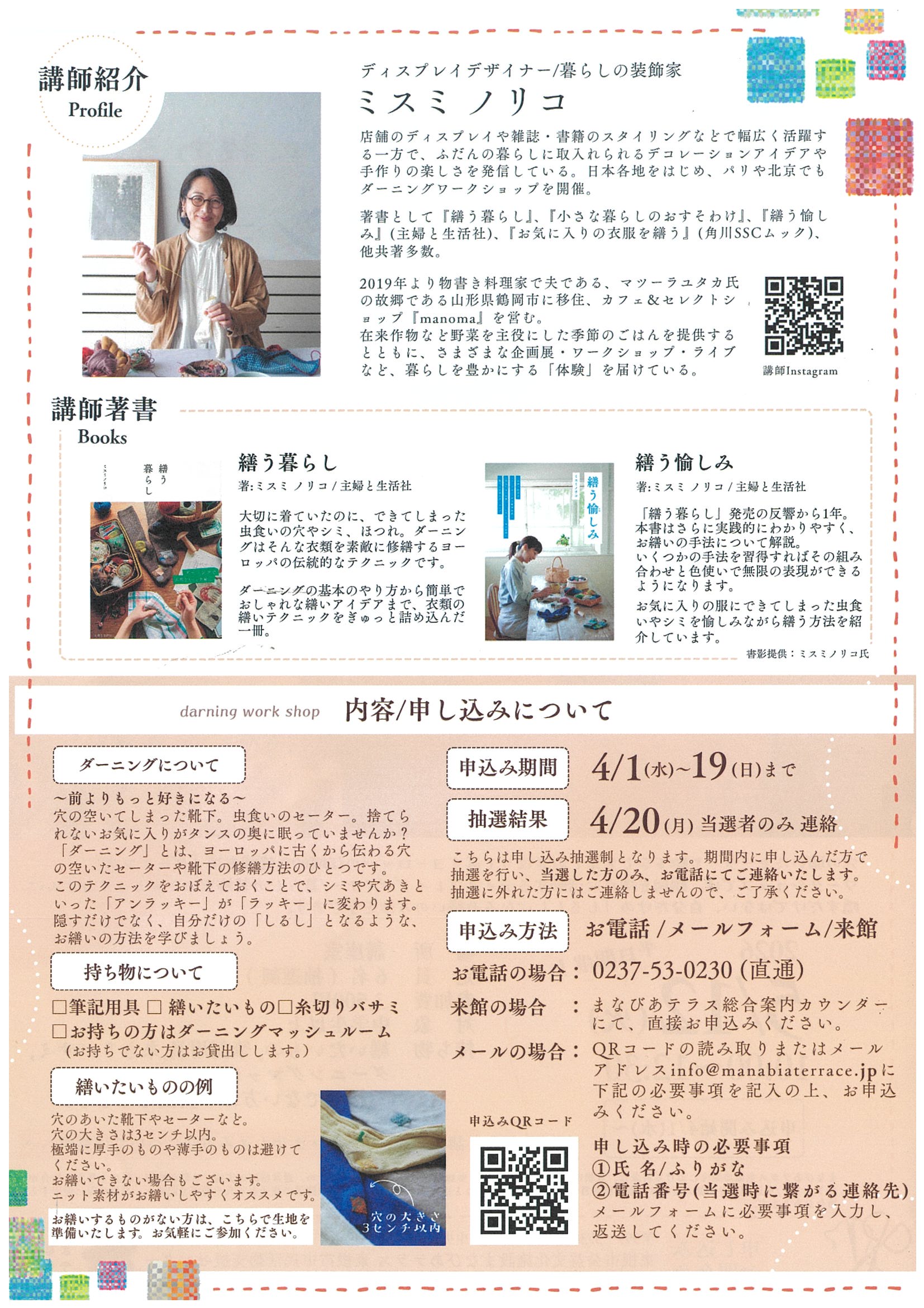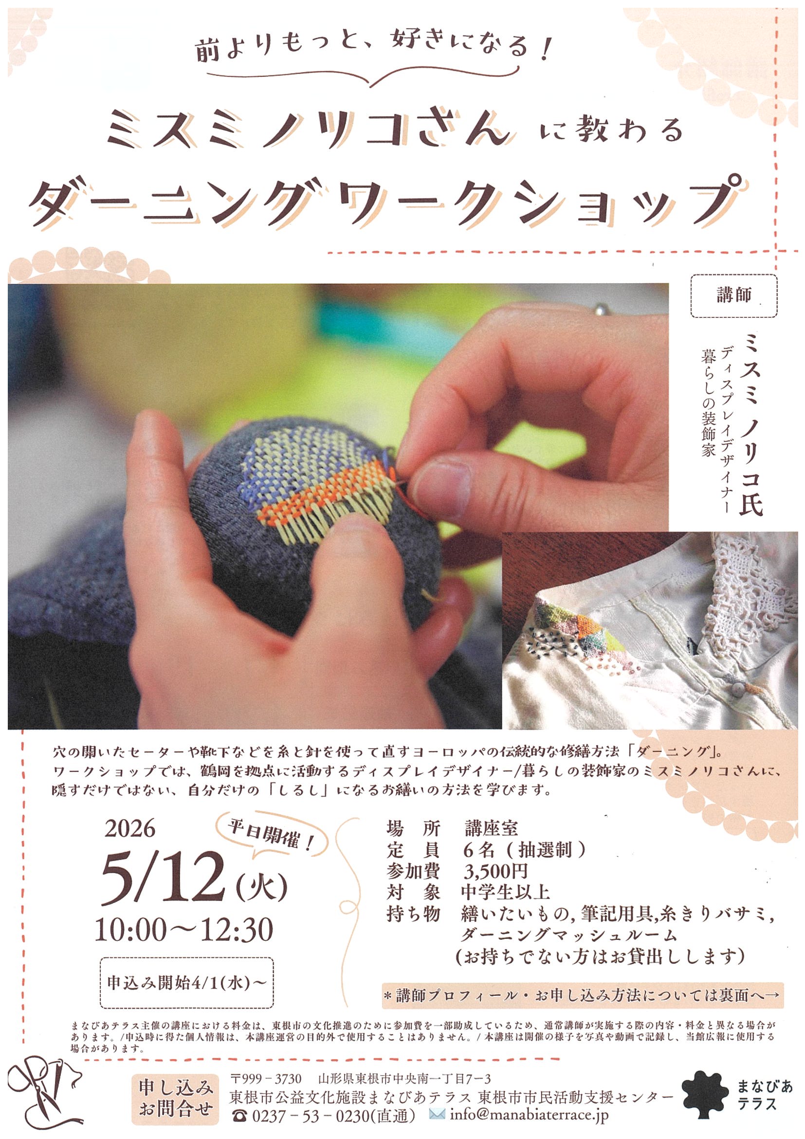 « すべてのイベント ミスミノリコさんに教わるダーニングワークショップ 5月 12日10:00 - 12:30 3,500円 « 第15期 山形県要約筆記者養成講座 第55回 哲学カフェ ~人生に「必要」なもの~ » チラシはこちら→ワークショップ(PDF形式) + Google カレンダー+ iCal エクスポート 詳細 日付: 5月 12日 時間: 10:00 - 12:30 参加費: 3,500円 イベントカテゴリー: 団体主催 主催者 まなびあテラス 市民活動支援センター 電話番号: 0237-57-0230 Web サイト: http://www.manabiaterrace.jp 会場 まなびあテラス 講座室 東根市中央南1-7-3 + Google マップ