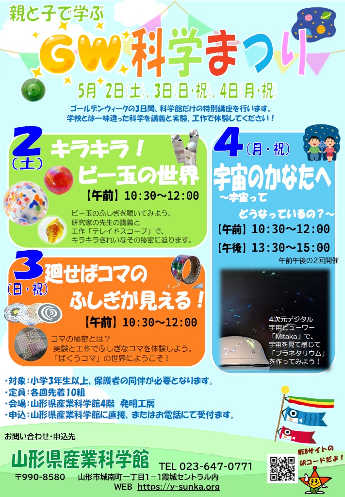 « すべてのイベント GW科学まつり「キラキラ!ビー玉の世界」 5月 2日10:30 - 12:00 « 吉野森林祭 『吉野公園桜鑑賞会』 全国ギャンブル依存症家族の会@山形 » + Google カレンダー+ iCal エクスポート 詳細 日付: 5月 2日 時間: 10:30 - 12:00 イベントカテゴリー: 団体主催 主催者 山形県産業科学館 電話番号: 023-647-0771 Web サイト: http://y-sunka.org/ 会場 山形県産業科学館4階発明工房 城南町1-1-1 山形市, 山形県 990-8580 + Google マップ