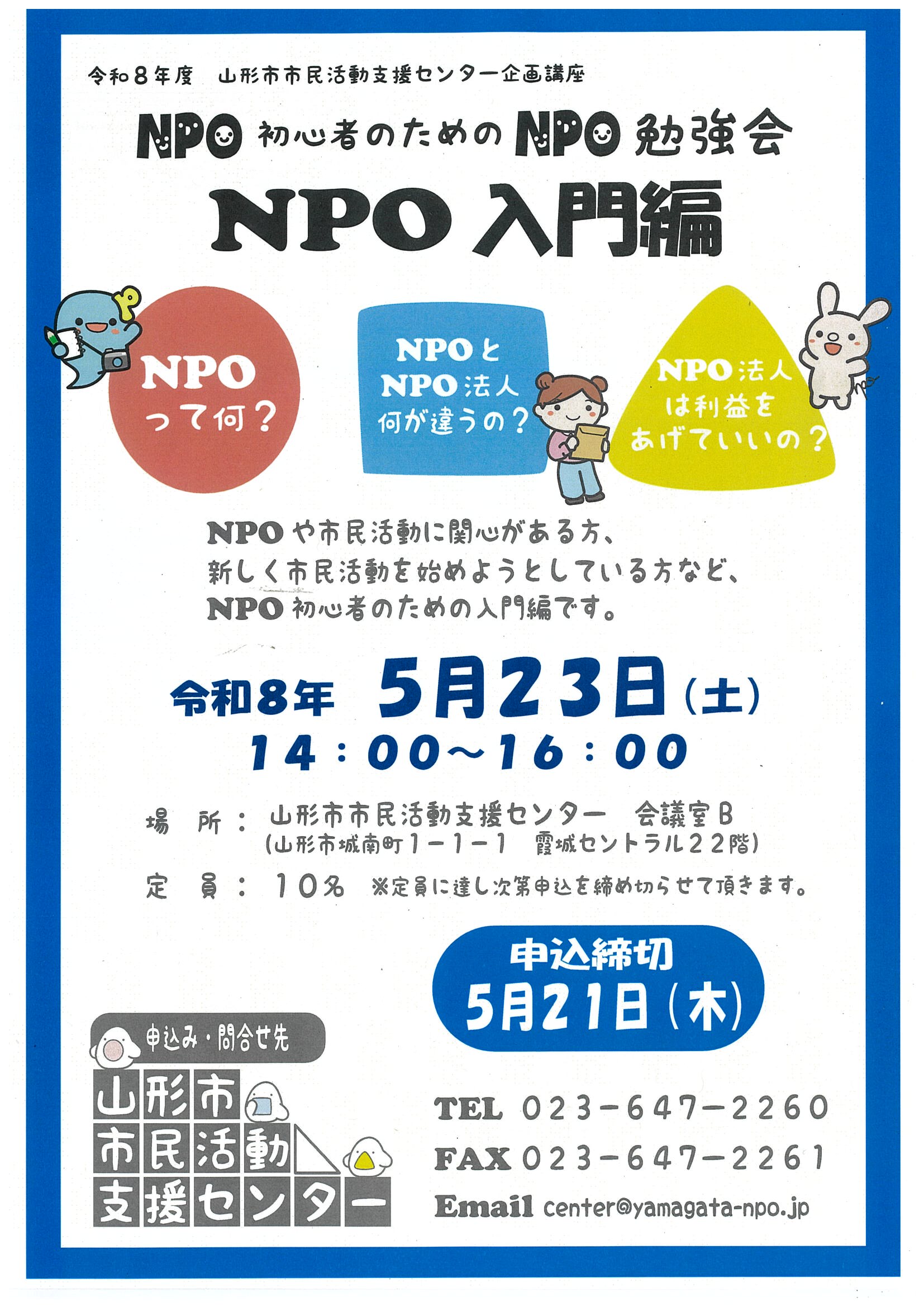 « すべてのイベント NPO初心者のためのNPO勉強会~NPO入門編~ 5月 23日14:00 - 16:00 無料 « 復職前に整える、わたしの心~がんばりすぎないための心のヒント~ 第1部 多文化子育てカフェ 山形で子育てを楽しもう! » 申込用紙はこちらからダウンロードできます。 ⇒NPO入門編(PDF形式) + Google カレンダー+ iCal エクスポート 詳細 日付: 5月 23日 時間: 14:00 - 16:00 参加費: 無料 イベントカテゴリー: センター主催 イベント タグ: 参加申し込み受付中の講座 主催者 山形市市民活動支援センター 電話番号: 023-647-2260 メール: center@yamagata-npo.jp 会場 山形市市民活動支援センター 会議室B 城南町1-1-1 霞城セントラル 山形市, 山形県 9908580 日本 + Google マップ 電話番号: 023-647-2260