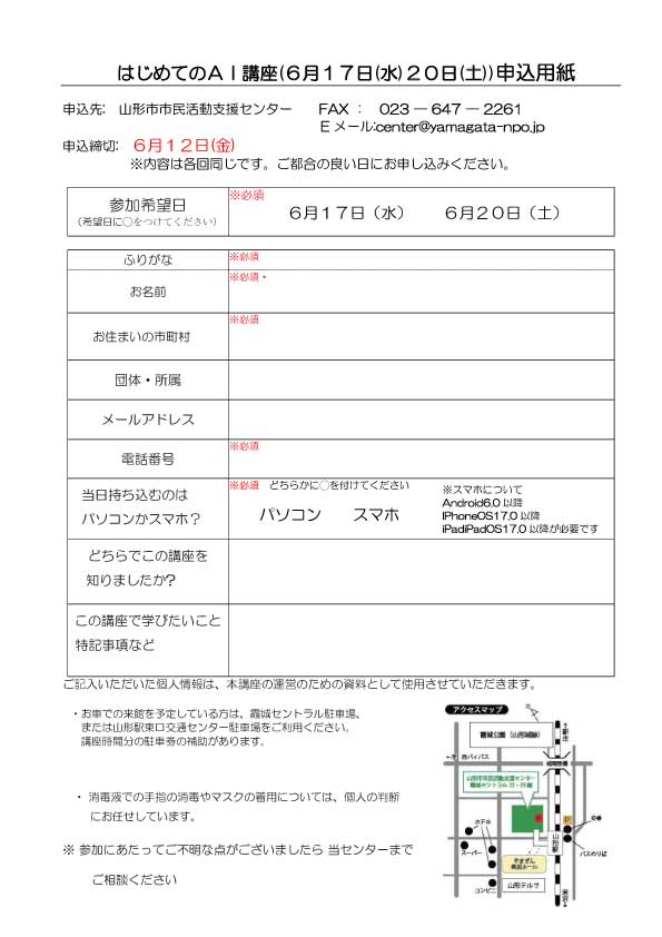 « すべてのイベント 市民活動のためのはじめてのAI ~正しく活用するための基礎知識~ 6月 17日10:00 - 12:00 « 地域食堂「楽(らく)」 あなたも「とぴボラ」してみませんか? » チラシはこちらからダウンロード出来ます(PDF形式) 申込用紙はこちらからダウンロード出来ます(Word形式) + Google カレンダー+ iCal エクスポート 詳細 日付: 6月 17日 時間: 10:00 - 12:00 イベントカテゴリー: センター主催 主催者 山形市市民活動支援センター 電話番号: 023-647-2260 メール: center@yamagata-npo.jp 会場 山形市市民活動支援センター 会議室B 城南町1-1-1 霞城セントラル 山形市, 山形県 9908580 日本 + Google マップ 電話番号: 023-647-2260