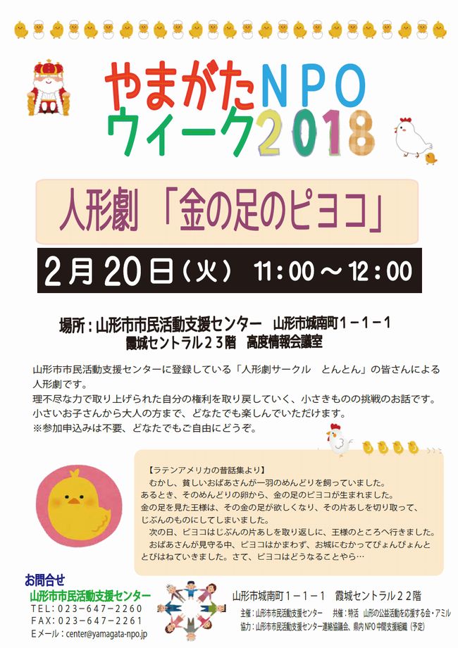 « すべてのイベント このイベントは終了しました。 人形劇「金の足のピヨコ」 2018年2月20日11:00 - 12:00 « パーキンソン病 遊びりのご案内 木質バイオマス普及セミナー » ■チラシPDFデータは、こちらからダウンロードすることができます + Google カレンダー+ iCal エクスポート 詳細 日付: 2018年2月20日 時間: 11:00 - 12:00 イベントカテゴリー: センター主催 主催者 山形市市民活動支援センター 電話番号: TEL:023-647-2260 メール: center@yamagata-npo.jp 会場 山形市市民活動支援センター 23階 高度情報会議室 山形市城南町1-1-1 霞城セントラル23階 山形市, 山形県 9908580 日本 + Google マップ