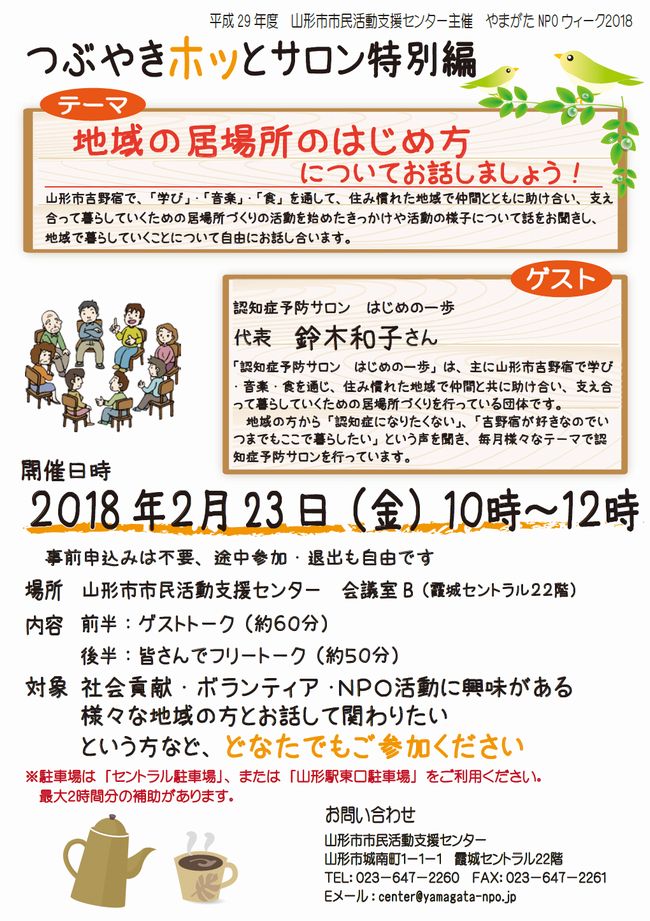 « すべてのイベント このイベントは終了しました。 つぶやきホッとサロン特別編 2018年2月23日10:00 - 12:00 « やまがたNPOウィーク2018 東北の未来をつくる新しい資金を知る会議 » ■チラシPDFデータは、こちらからダウンロードすることができます + Google カレンダー+ iCal エクスポート 詳細 日付: 2018年2月23日 時間: 10:00 - 12:00 イベントカテゴリー: センター主催 主催者 山形市市民活動支援センター 電話番号: TEL:023-647-2260 メール: center@yamagata-npo.jp 会場 山形市市民活動支援センター会議室B