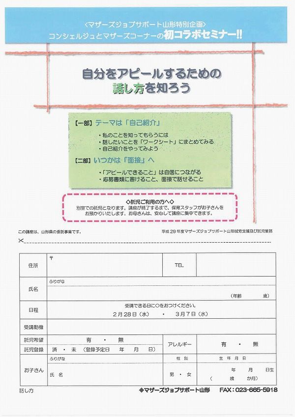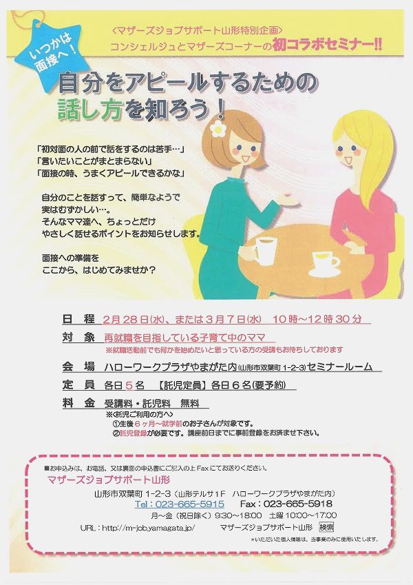 « すべてのイベント このイベントは終了しました。 自分をアピールするための話し方を知ろう! 2018年2月28日10:00 - 12:00 « やまがた環境教育推進シンポジウム 多文化理解講座「世界をのぞけば…」 秘境の島バヌアツで見た人々の暮らし~現地の人と共に過ごした700日~ » チラシはこちらからダウンロードできます(PDFデータ) + Google カレンダー+ iCal エクスポート 詳細 日付: 2018年2月28日 時間: 10:00 - 12:00 イベントカテゴリー: 団体主催 主催者 マザーズジョブサポート山形 電話番号: 023-665-5915 Web サイト: http://m-job.yamagata.jp/ 会場 ハローワークプラザやまがた内 セミナールーム 双葉町1-2-3 山形市, 山形県 9900828 + Google マップ