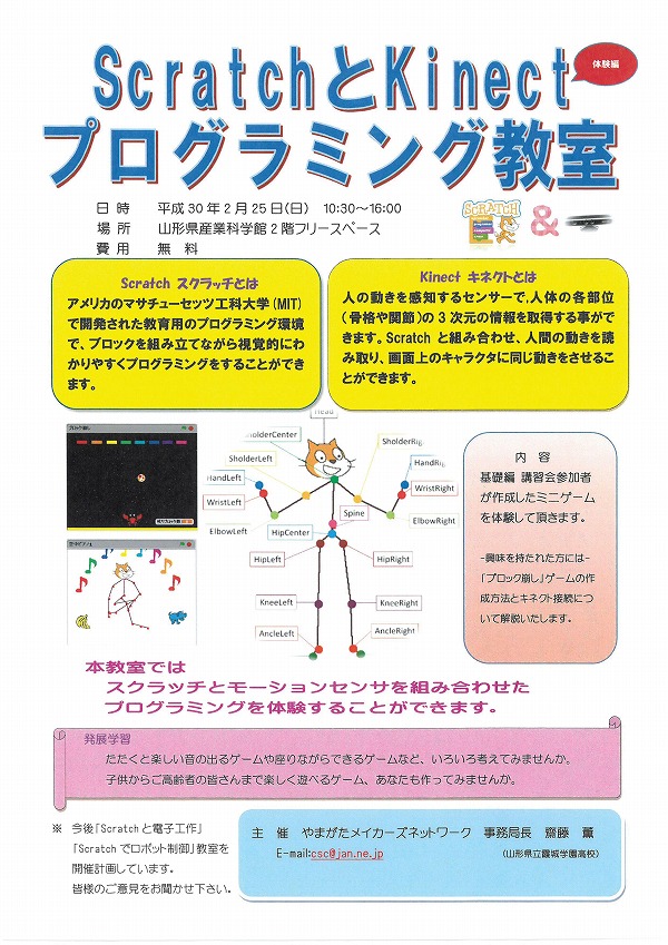 « すべてのイベント このイベントは終了しました。 ScratchとKinectプログラミング教室 体験編 2018年2月25日10:30 - 16:00 « やまがたNPOウィーク2018 子ども食堂「楽(らく)」 » チラシはこちらからダウンロードできます(PDFデータ) + Google カレンダー+ iCal エクスポート 詳細 日付: 2018年2月25日 時間: 10:30 - 16:00 イベントカテゴリー: 団体主催 主催者 やまがたメイカーズネットワーク メール: csc@jan.ne.jp 会場 山形県産業科学館4階発明工房 城南町1-1-1 山形市, 山形県 990-8580 + Google マップ