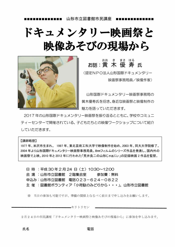 « すべてのイベント このイベントは終了しました。 山形市立図書館市民講座「ドキュメンタリー映画祭と映像あそびの現場から」 2018年2月24日10:30 - 12:00 無料 « おしゃべりカフェ 市民のための防災力アップ講座 » チラシはこちらからダウンロードできます(PDFファイル) + Google カレンダー+ iCal エクスポート 詳細 日付: 2018年2月24日 時間: 10:30 - 12:00 参加費: 無料 イベントカテゴリー: 団体主催 主催者 山形市立図書館ボランティア「小荷駄のみどりから…」 会場 山形市立図書館本館2階集会室