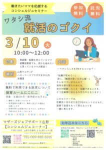 2026年3月10日のイベント イベント Search and Views Navigation イベントを検索 イベント Views Navigation 以下の形式で表示 リスト 月 Week 日 Map Photo イベント Search 当日 « 前の日 次の日 » 10:00 働きたいママを応援するコンシェルジュセミナー ワタシ流就活のゴクイ 3月 10日10:00 - 12:00 山形テルサ, 双葉町1-2-3 山形市, 山形県 9900828 + Google マップ 無料 チラシはこちら→ワタシ流就活のゴクイ(PDF形式) さらに詳しく » 10:30 まちなか保健室七日町 3月 10日10:30 - 14:30 Pont tree cafe(ポンツリーカフェ), 山形市七日町1-1-1 + Google マップ チラシはこちらよりダウンロードできます(PDF形式 さらに詳しく » 11:00 みんなのキャンバス 3月 10日11:00 - 15:00 Gallery&cafeあるあーる, 西根上川原42−42 寒河江市, 山形県 991-0003 + Google マップ チラシはこちら→みんなのキャンバス(PDF形式) さらに詳しく » + Export Events