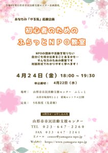 2026年4月24日のイベント イベント Search and Views Navigation イベントを検索 イベント Views Navigation 以下の形式で表示 リスト 月 Week 日 Map Photo イベント Search 当日 « 前の日 次の日 » 18:00 あなたの「やる気」応援企画 初心者のためのふらっとNPO教室 4月 24日18:00 - 19:30 山形市市民活動支援センター ふらっと, 山形市城南町1-1-1 霞城セントラル22階 + Google マップ チラシはこちらからダウンロードできます(PDF形式 さらに詳しく » + Export Events